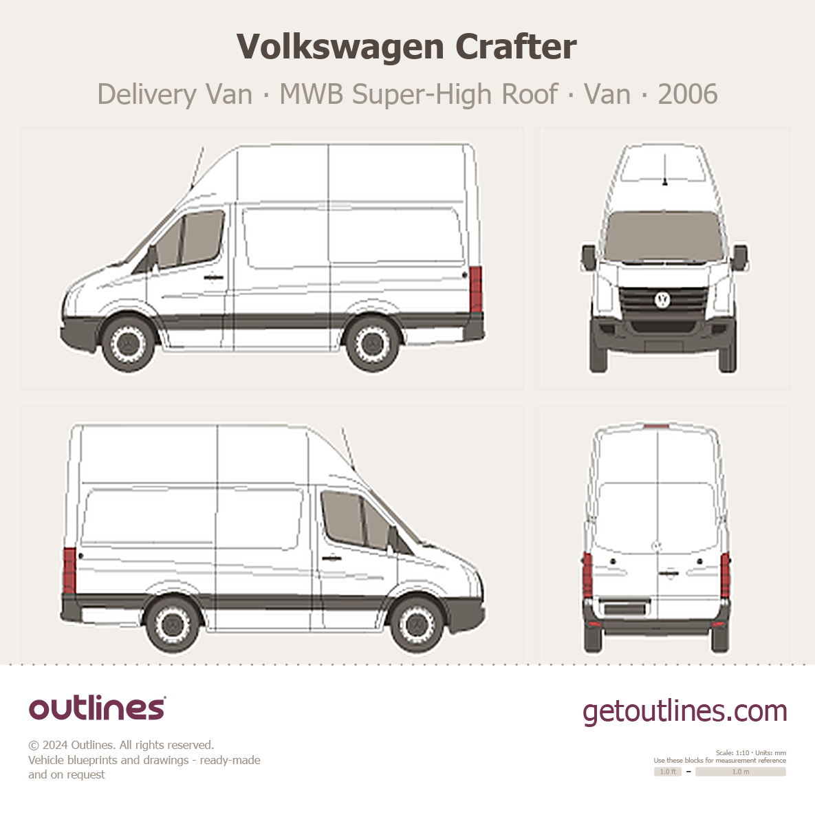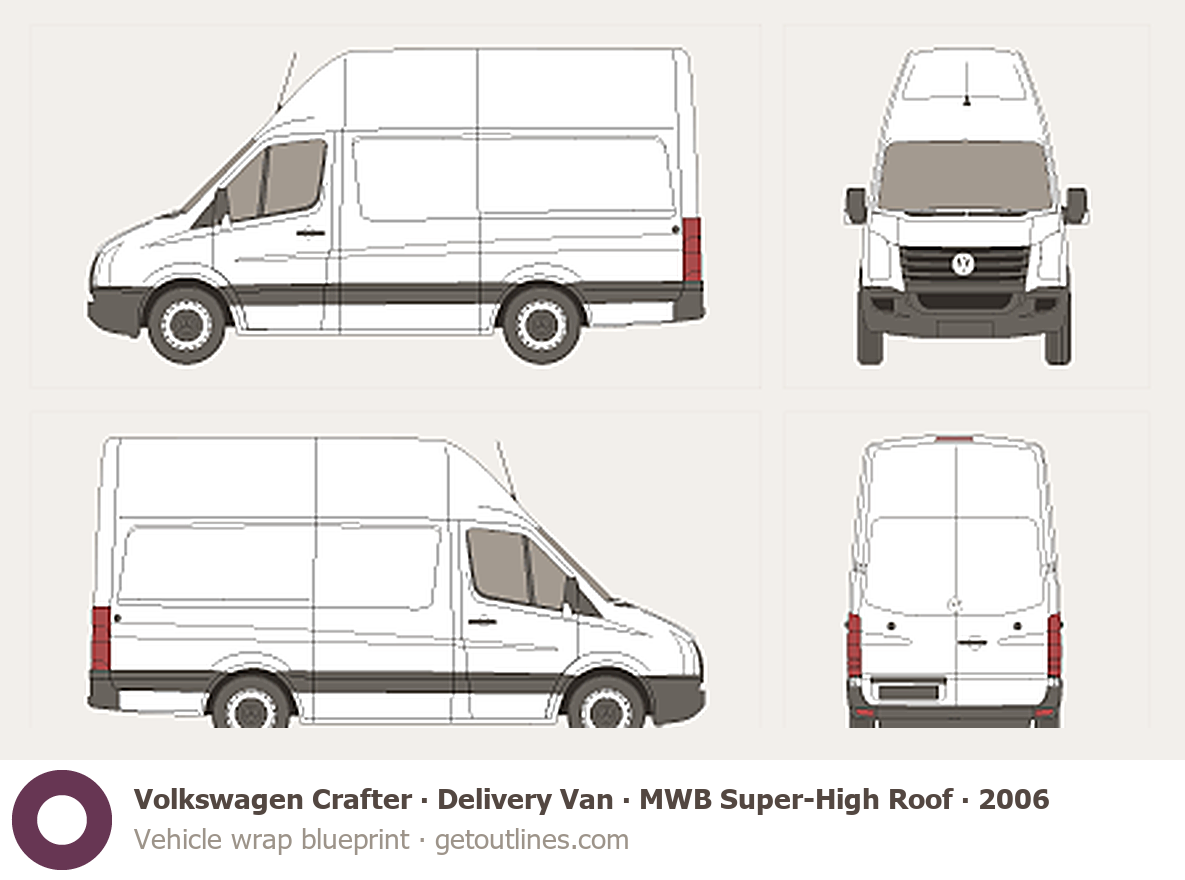 This 2006 Volkswagen Crafter Delivery Van MWB Super-High Roof Van blueprint helps designers, wrap studios, and 3D artists simplify their workflow and save valuable time for creative work instead of routine tasks.