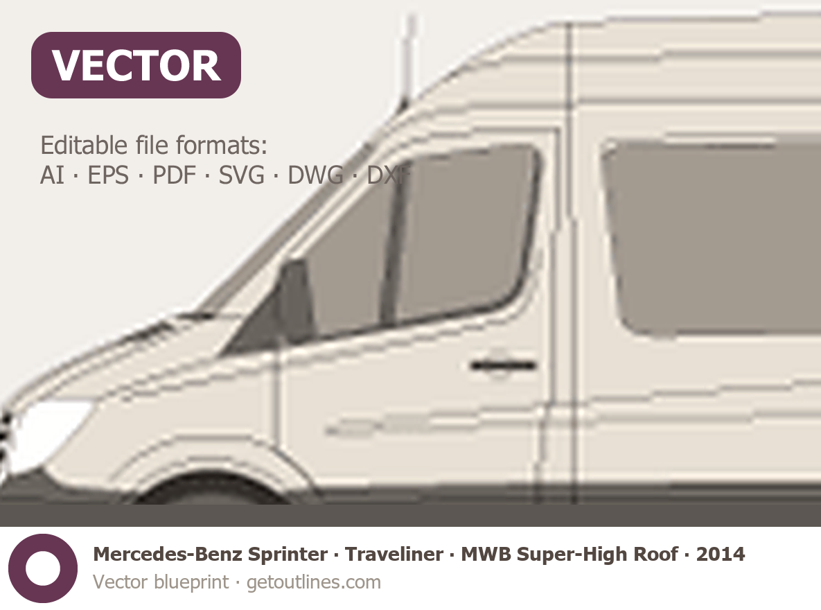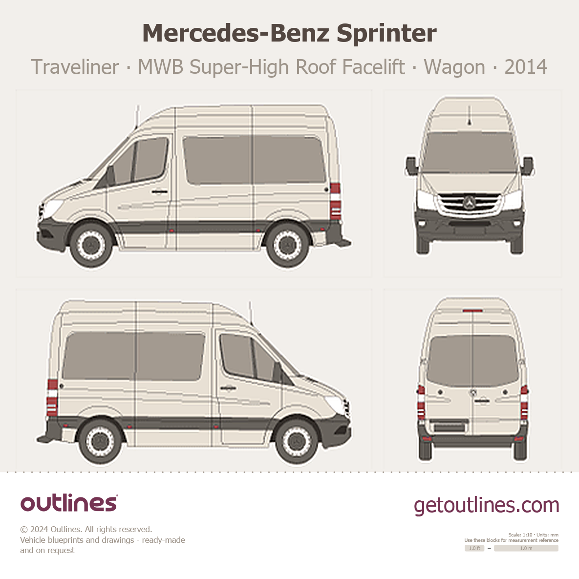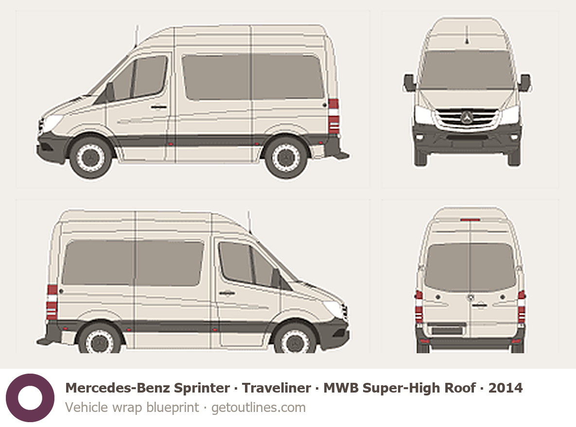 This 2014 Mercedes-Benz Sprinter Traveliner MWB Super-High Roof Facelift Wagon blueprint helps designers, wrap studios, and 3D artists simplify their workflow and save valuable time for creative work instead of routine tasks.