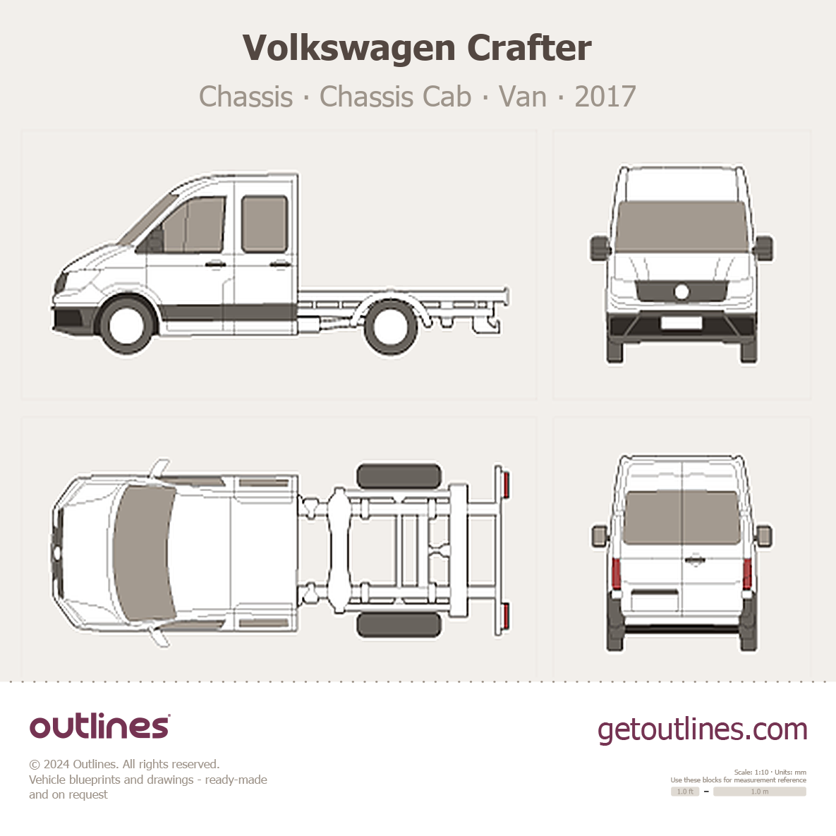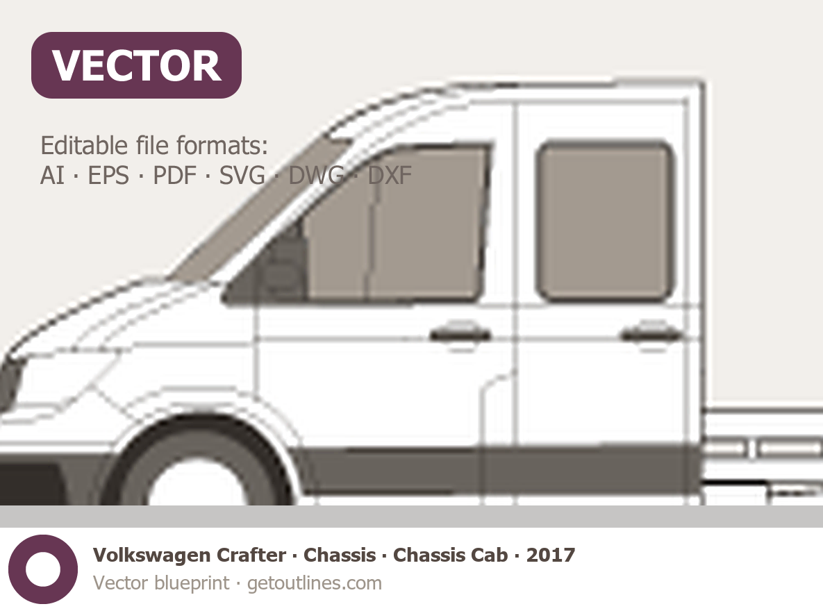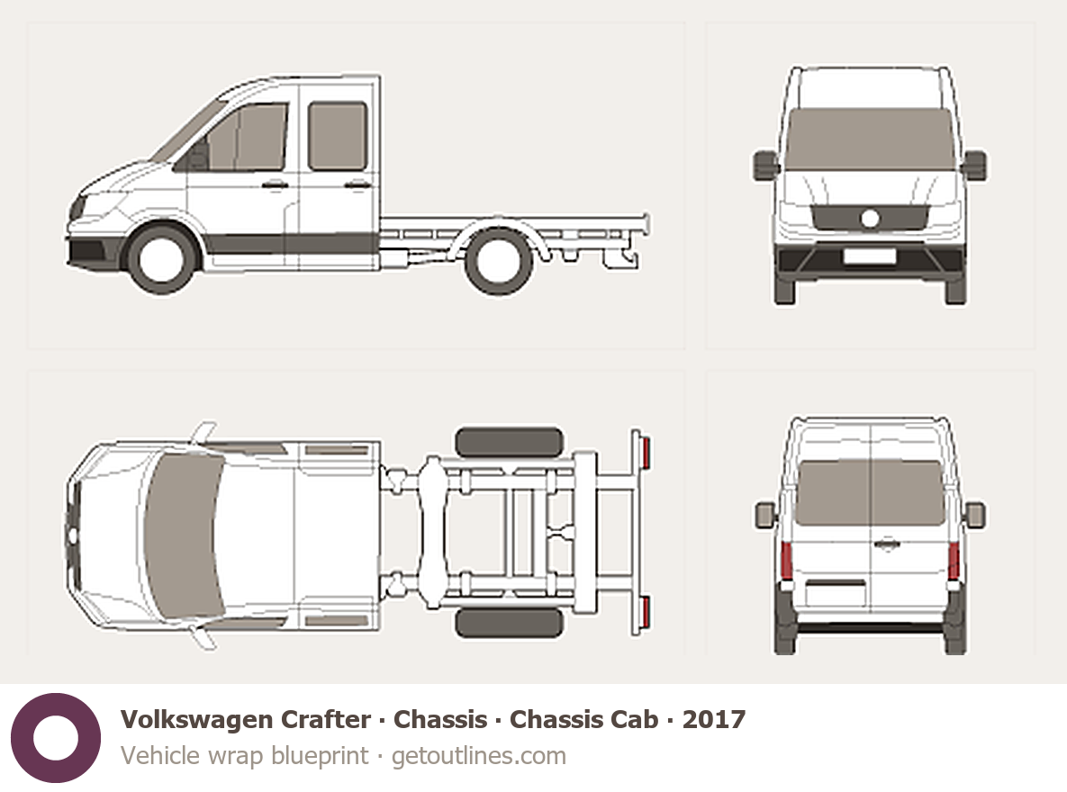 This 2017 Volkswagen Crafter Chassis Chassis Cab Van blueprint helps designers, wrap studios, and 3D artists simplify their workflow and save valuable time for creative work instead of routine tasks.