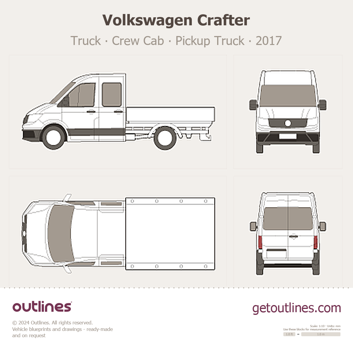 This is a blueprint of the Crafter, produced by carmaker Volkswagen in 2017 - Present (2025, 2026). It features a Pickup Truck body design and is classified as a Commercial vehicle.