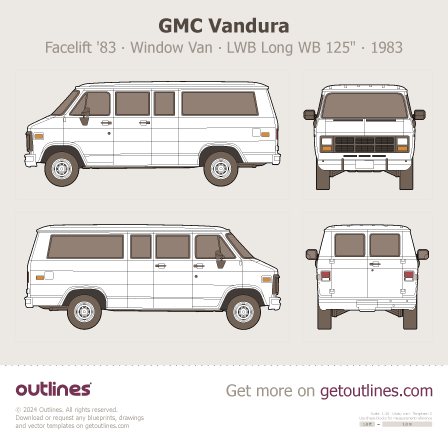 This 1983 GMC Vandura Facelift '83 Window Van ∙ LWB ∙ Long WB 125" Minivan blueprint helps designers, wrap studios, and 3D artists simplify their workflow and save valuable time for creative work instead of routine tasks.