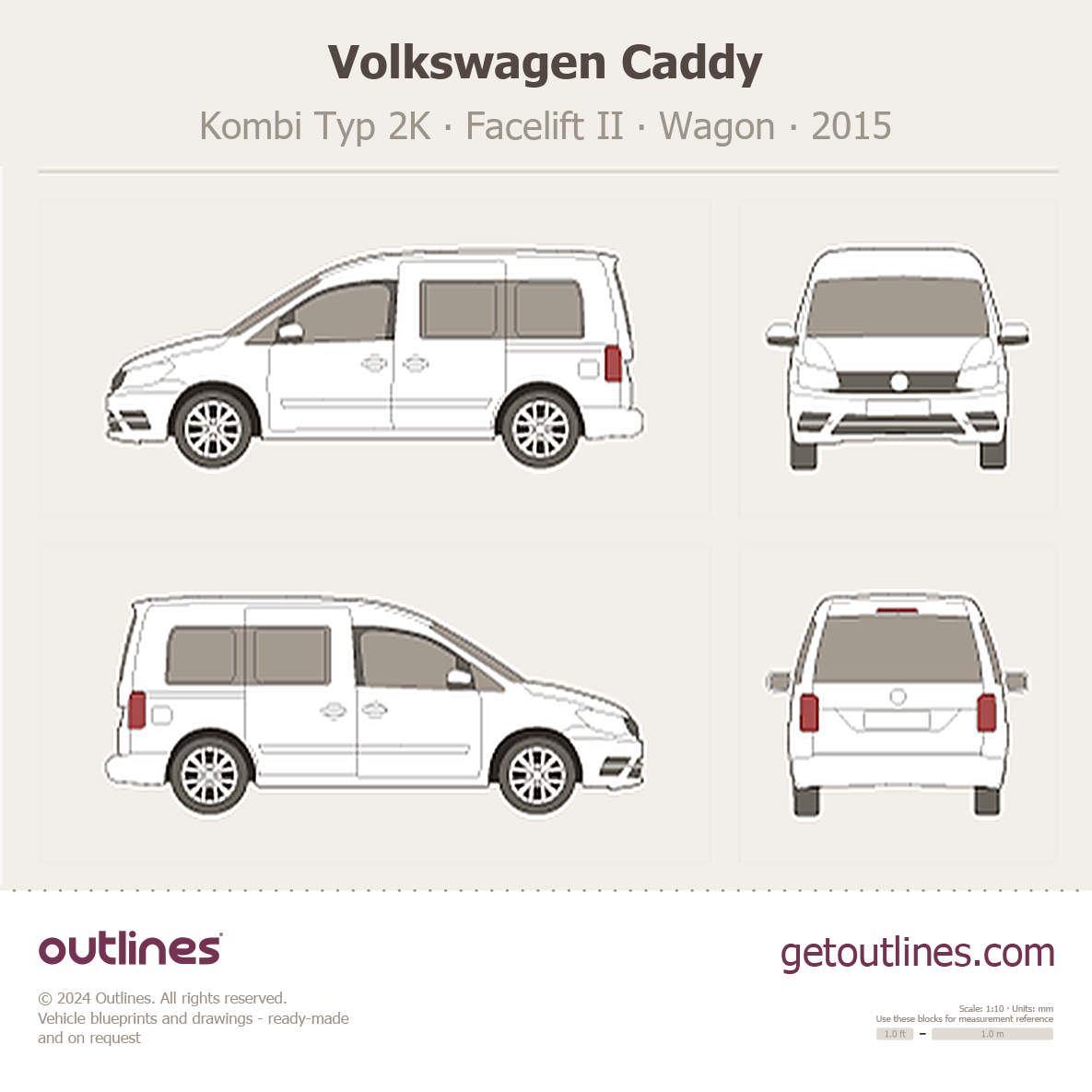 Buy this Volkswagen Caddy Kombi Typ 2K blueprint and line drawing in high-quality editable vector file formats. Best for 3D and car wrap design.