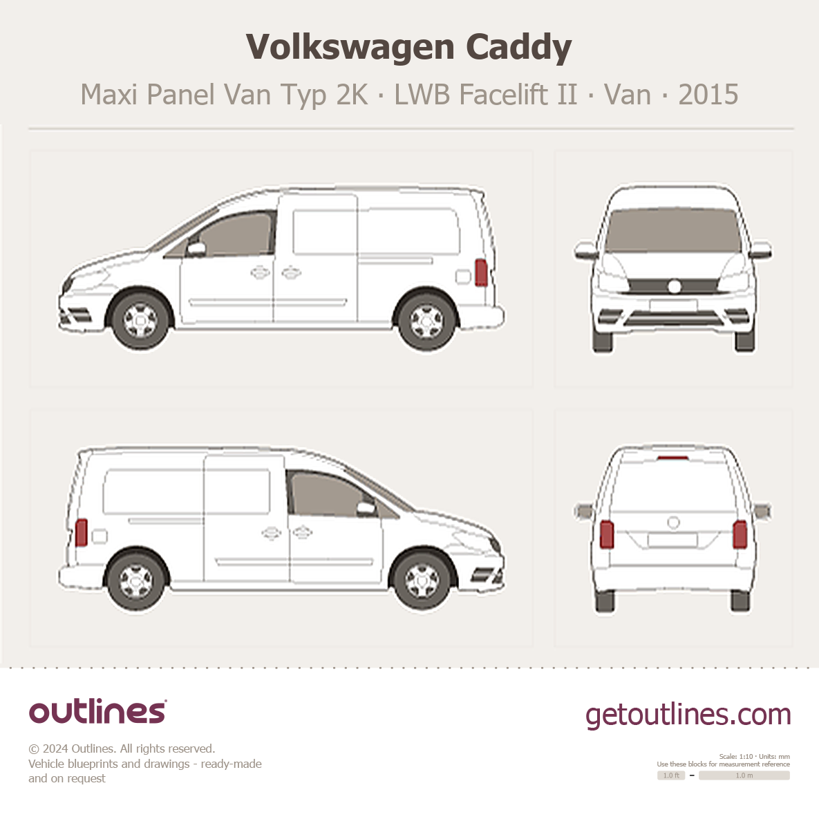 Buy this Volkswagen Caddy Maxi Panel Van Typ 2K blueprint and line drawing in high-quality editable vector file formats. Best for 3D and car wrap design.