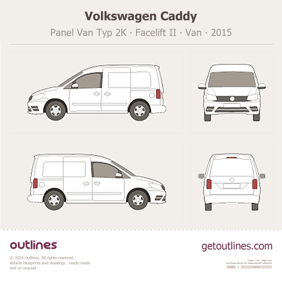 Buy this Volkswagen Caddy Panel Van Typ 2K blueprint and line drawing in high-quality editable vector file formats. Best for 3D and car wrap design.