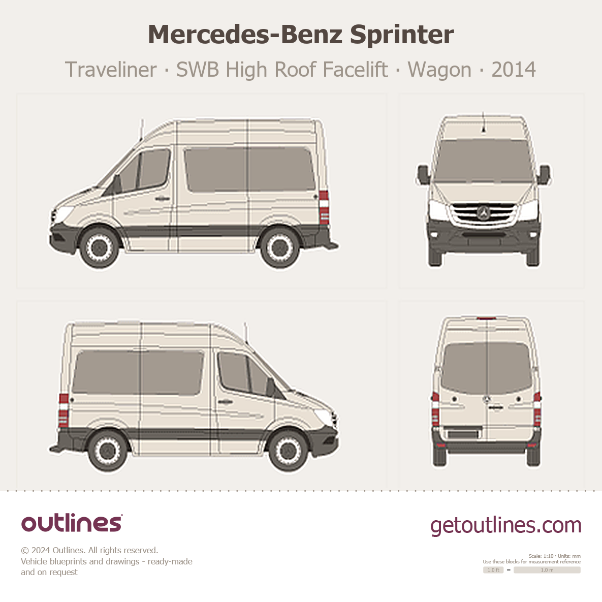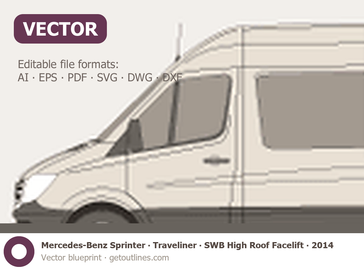 This 2014 Mercedes-Benz Sprinter Traveliner SWB High Roof Facelift Wagon blueprint helps designers, wrap studios, and 3D artists simplify their workflow and save valuable time for creative work instead of routine tasks.