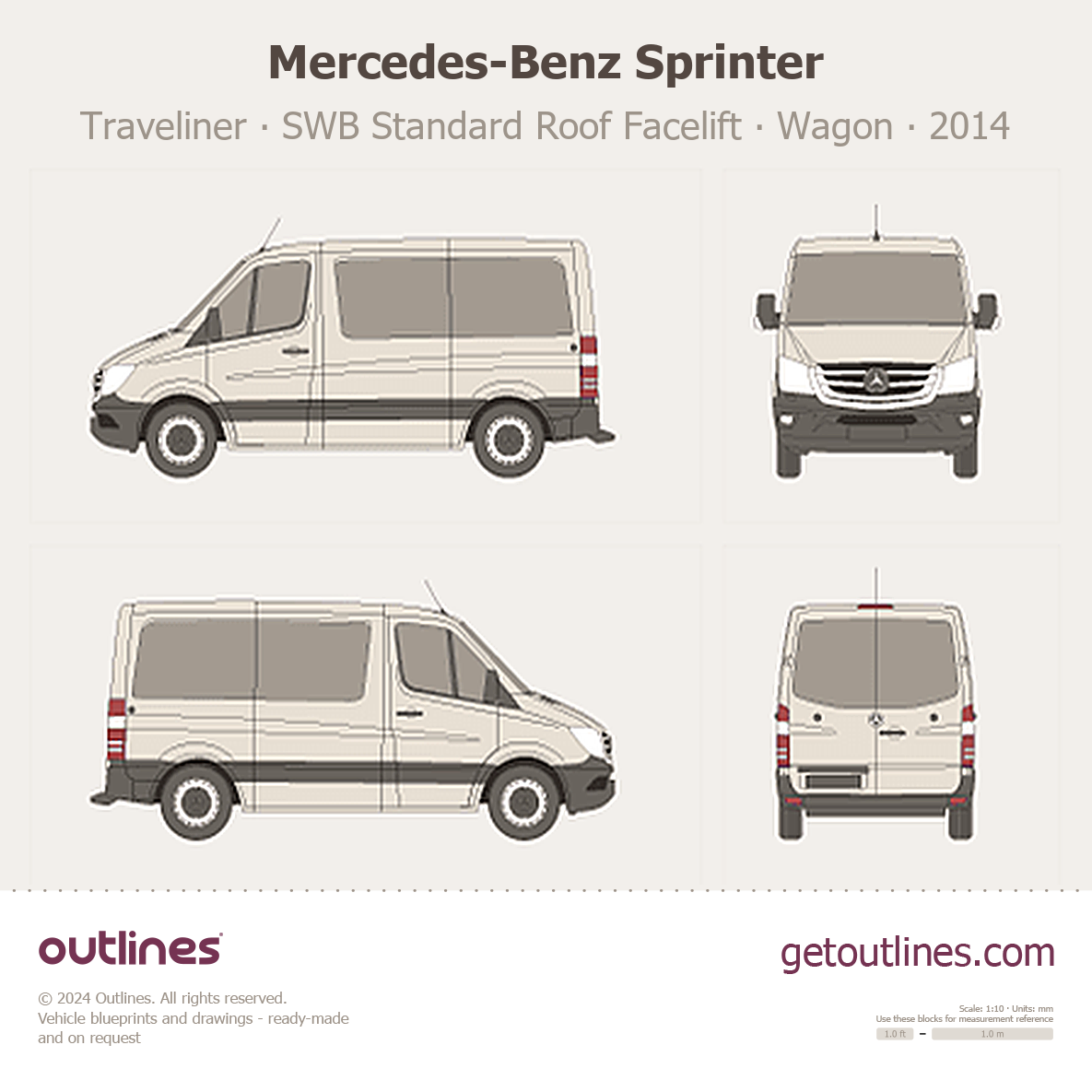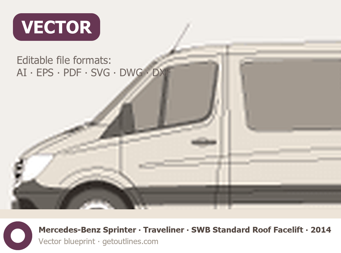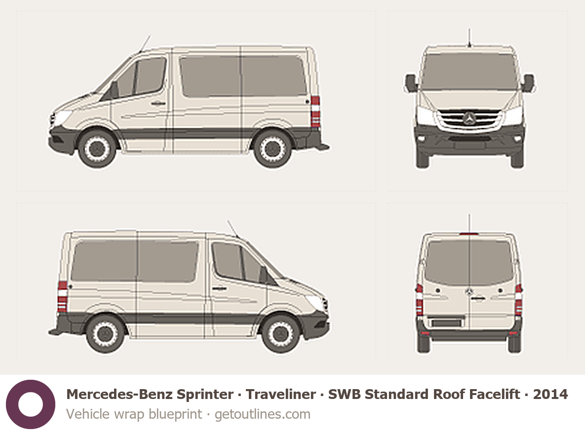 This 2014 Mercedes-Benz Sprinter Traveliner SWB Standard Roof Facelift Wagon blueprint helps designers, wrap studios, and 3D artists simplify their workflow and save valuable time for creative work instead of routine tasks.