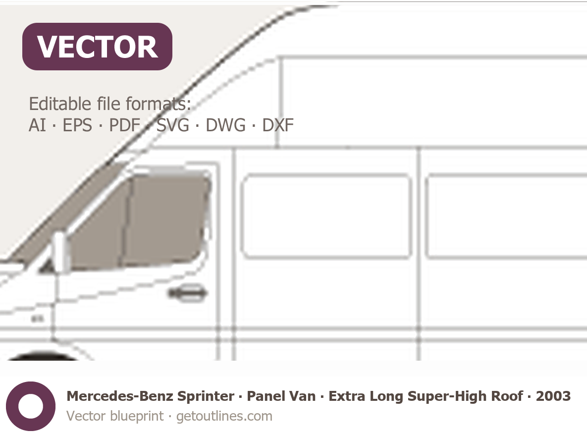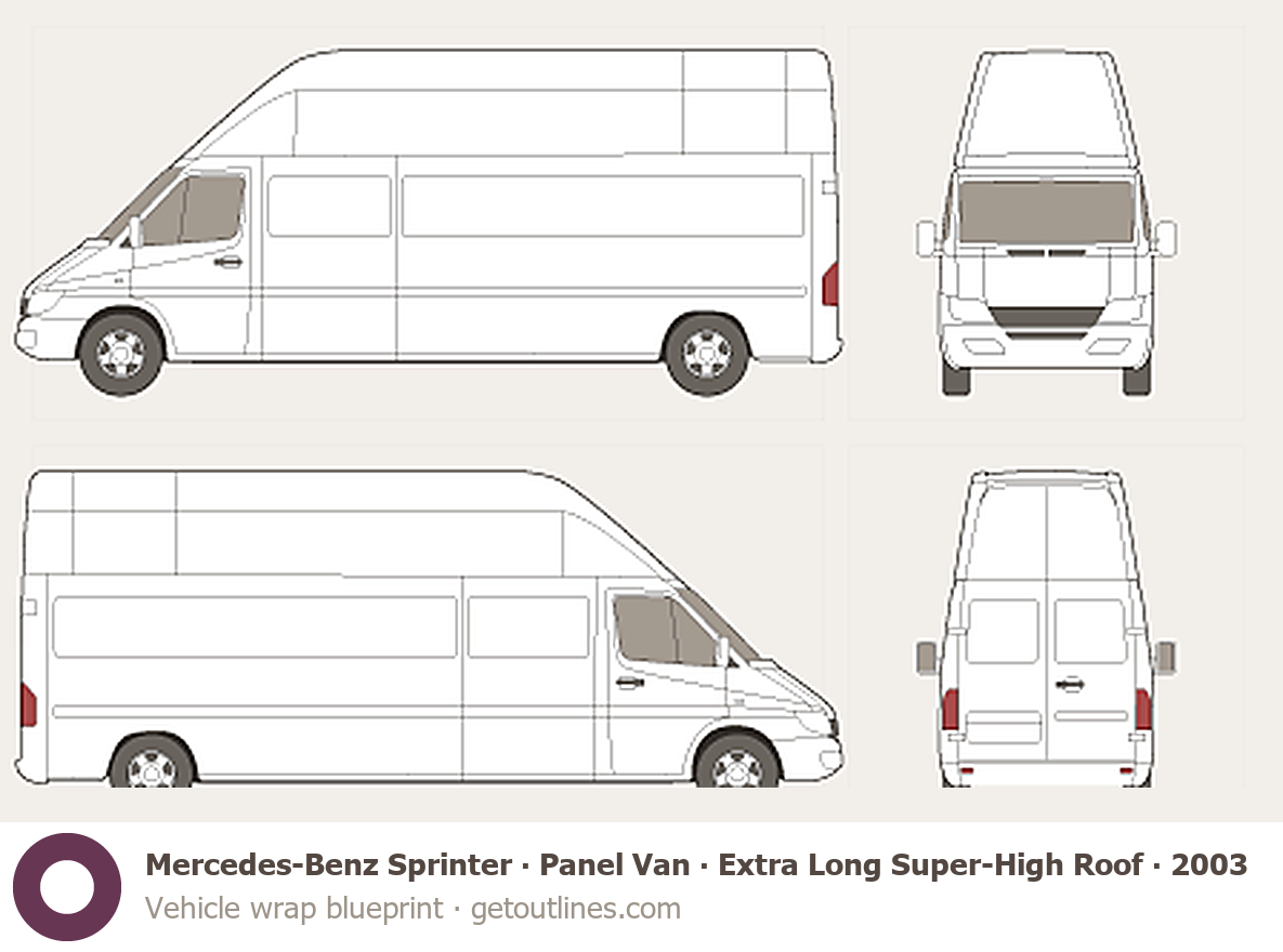This 2003 Mercedes-Benz Sprinter Panel Van Extra Long Super-High Roof Facelift Van blueprint helps designers, wrap studios, and 3D artists simplify their workflow and save valuable time for creative work instead of routine tasks.