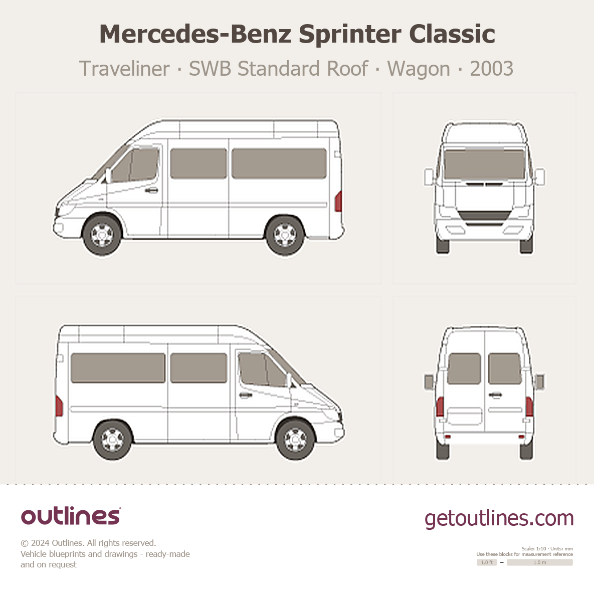 This 2003 Mercedes-Benz Sprinter Classic Traveliner SWB Standard Roof Wagon blueprint helps designers, wrap studios, and 3D artists simplify their workflow and save valuable time for creative work instead of routine tasks.