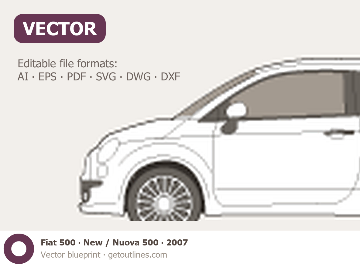 This 2007 Fiat 500 New / Nuova 500 Hatchback blueprint helps designers, wrap studios, and 3D artists simplify their workflow and save valuable time for creative work instead of routine tasks.