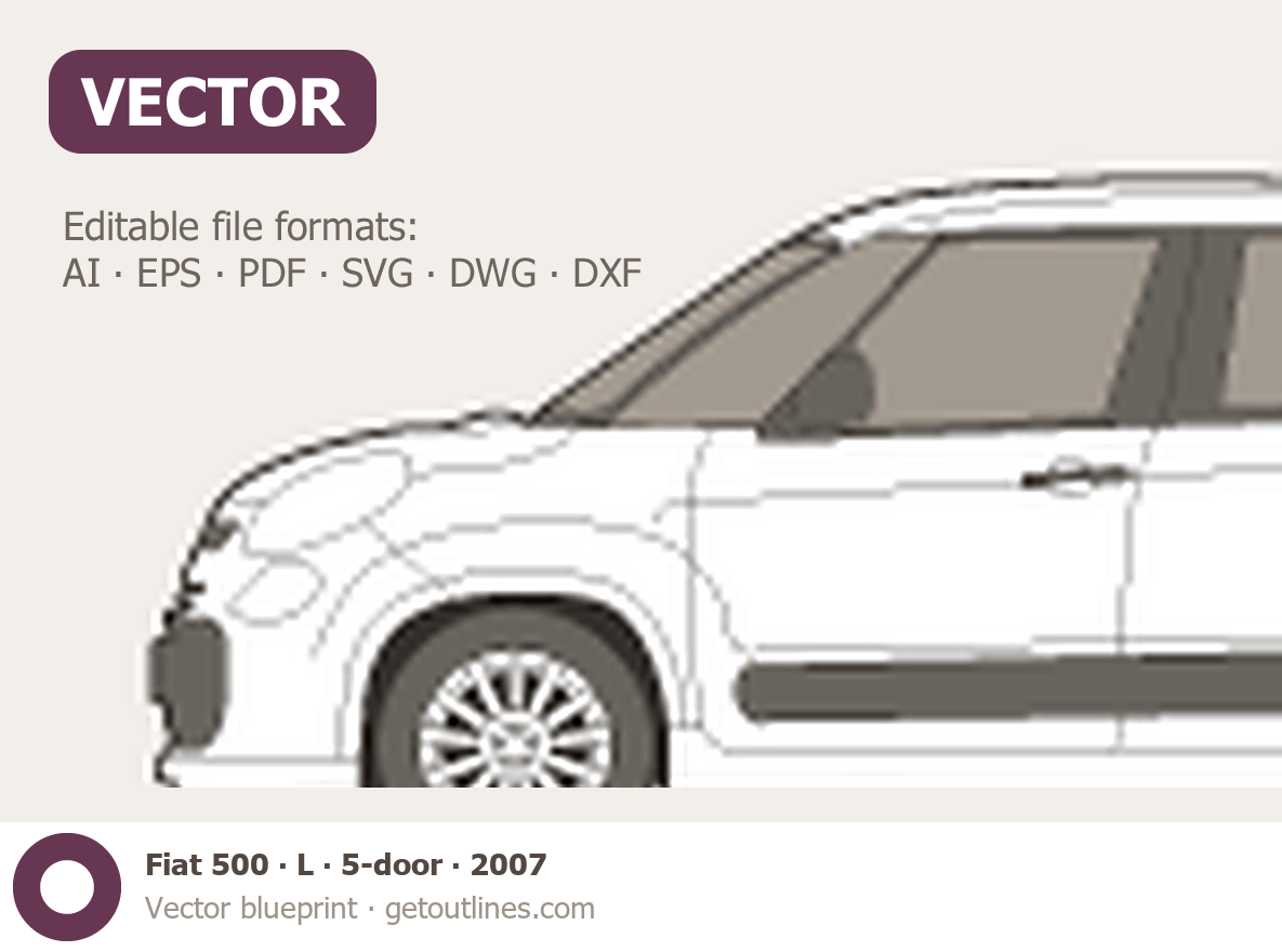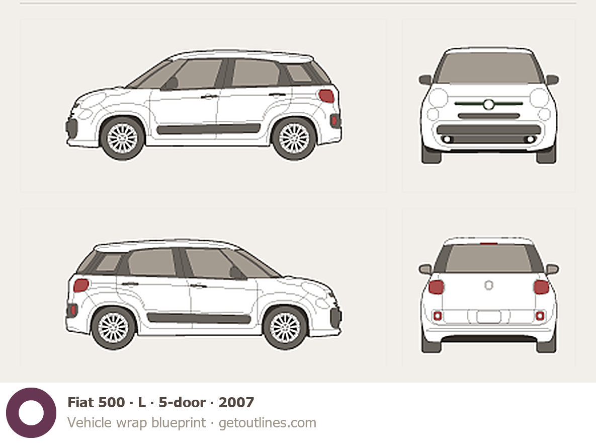 This 2007 Fiat 500 L 5-door Hatchback blueprint helps designers, wrap studios, and 3D artists simplify their workflow and save valuable time for creative work instead of routine tasks.