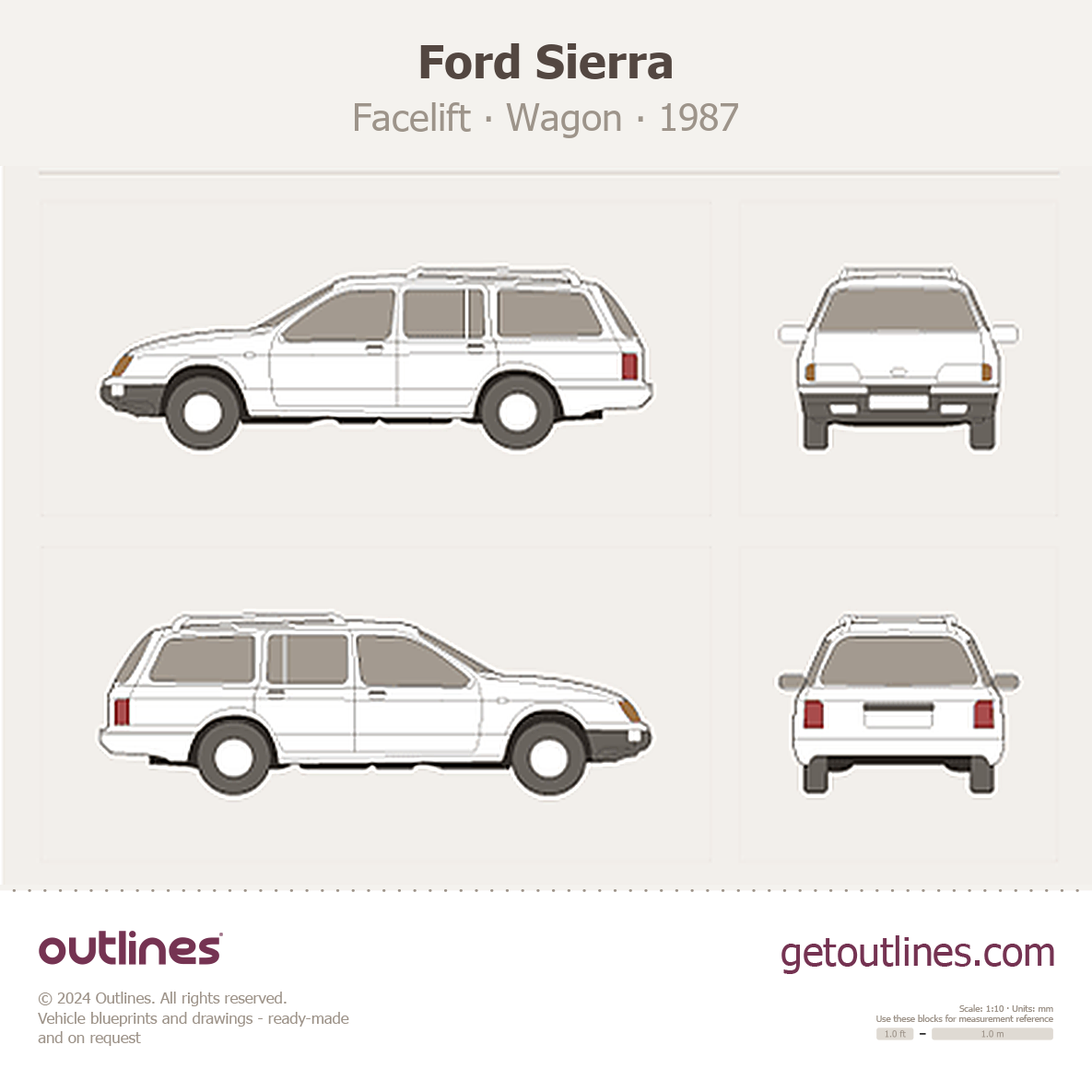 This is a blueprint of the Sierra, produced by carmaker Ford in 1987 - 1993. It features a Wagon body design and is classified as a Family vehicle.