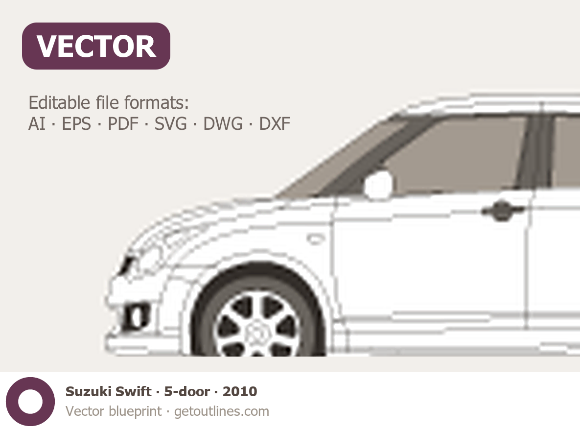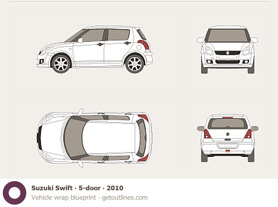This 2010 Suzuki Swift 5-door Hatchback blueprint helps designers, wrap studios, and 3D artists simplify their workflow and save valuable time for creative work instead of routine tasks.