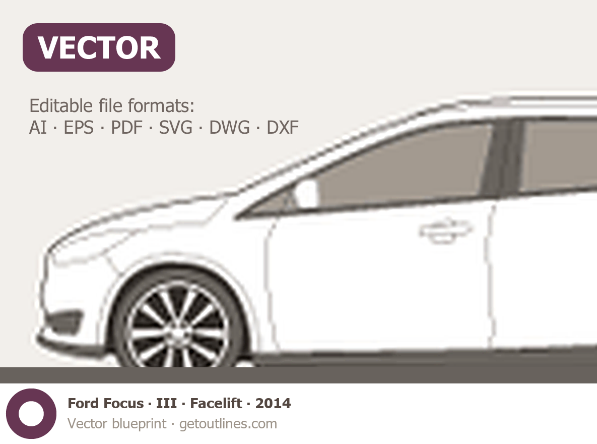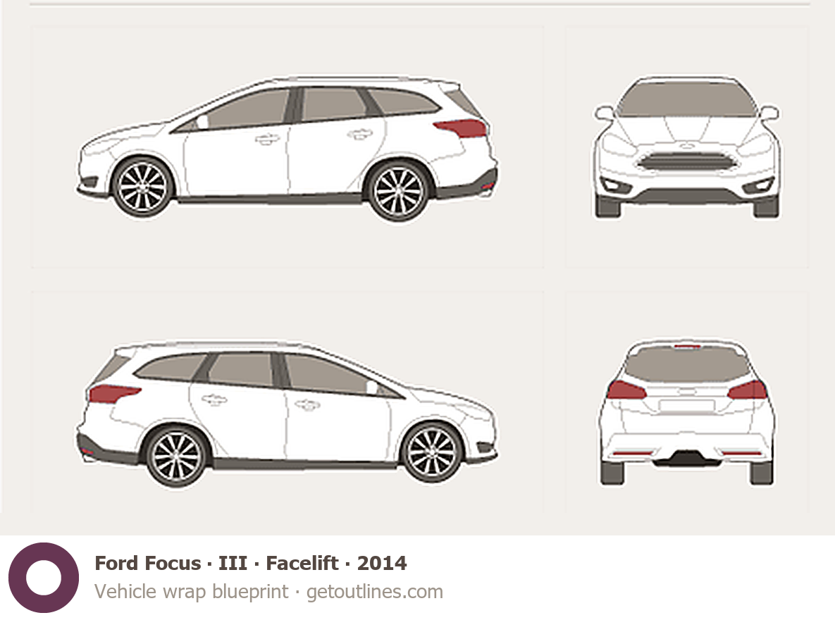 This 2014 Ford Focus III Facelift Wagon blueprint helps designers, wrap studios, and 3D artists simplify their workflow and save valuable time for creative work instead of routine tasks.