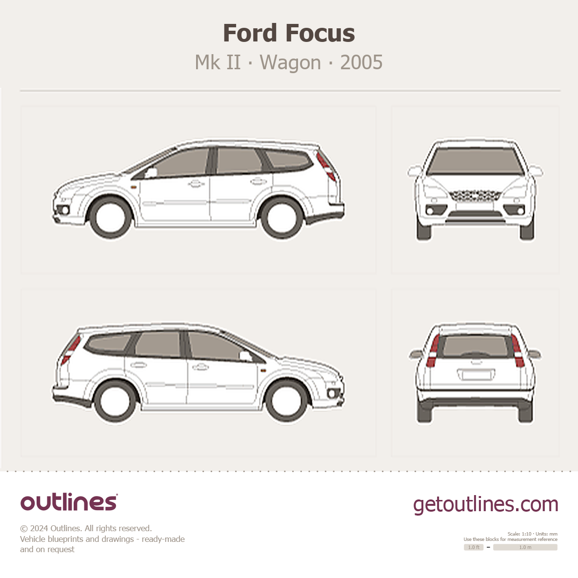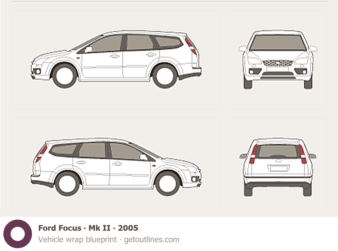 Buy this Ford Focus Mk II blueprint and line drawing in high-quality editable vector file formats. Best for 3D and car wrap design.