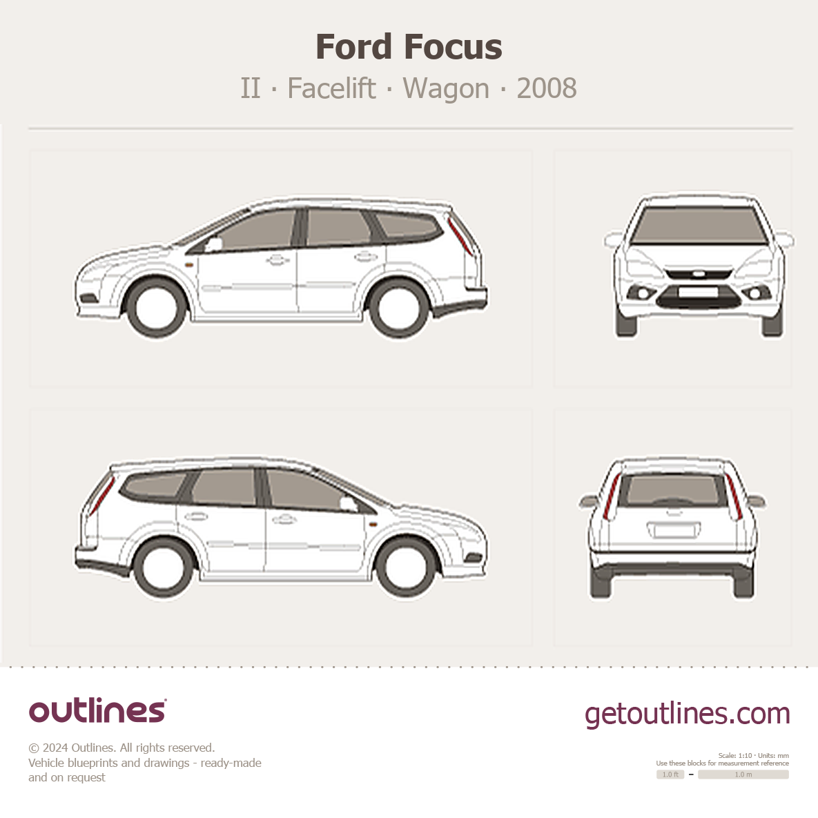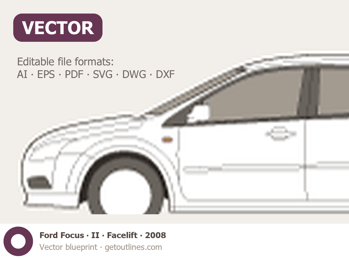 Buy this Ford Focus II blueprint and line drawing in high-quality editable vector file formats. Best for 3D and car wrap design.