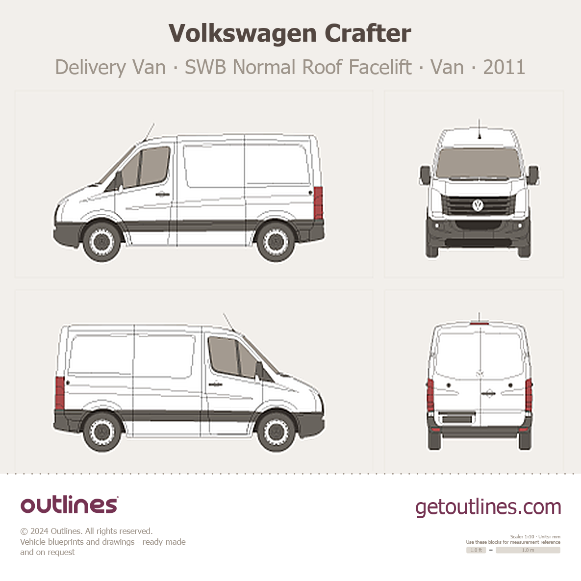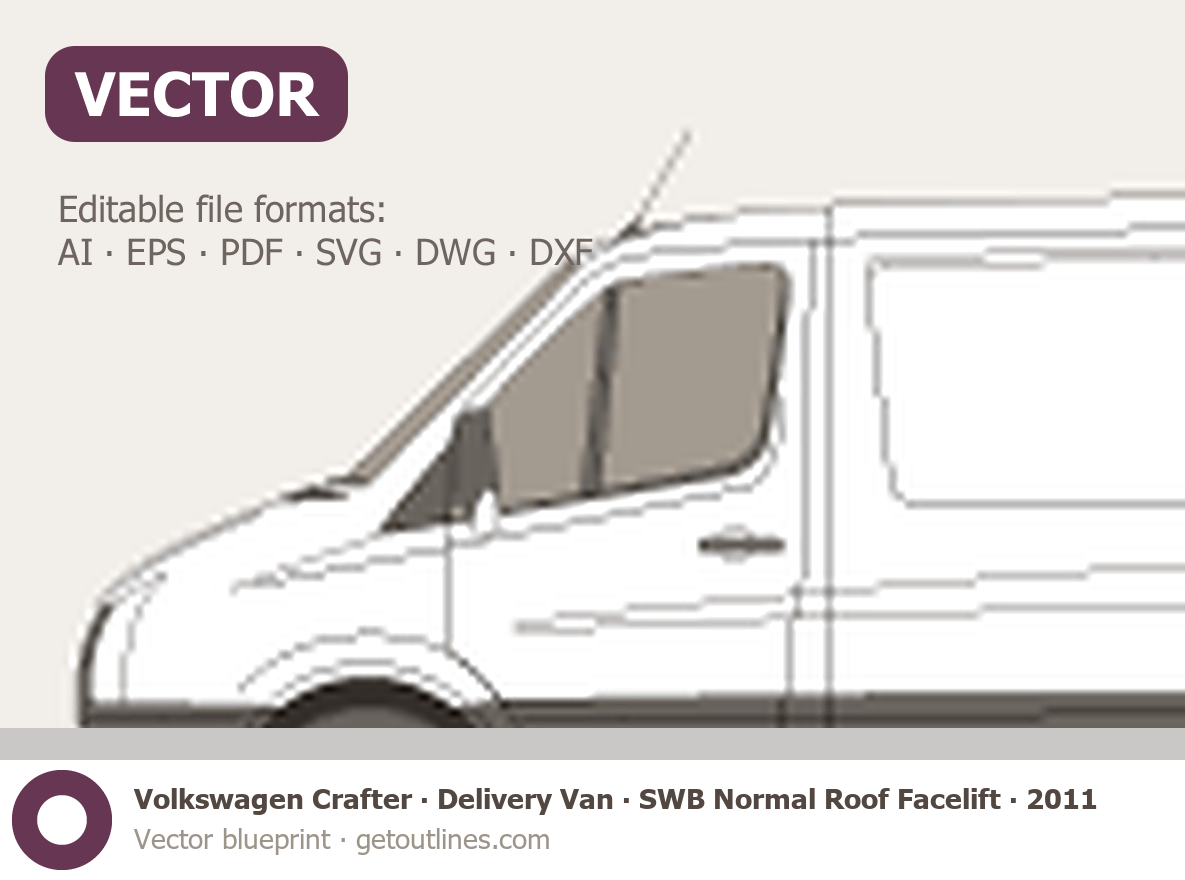 This 2011 Volkswagen Crafter Delivery Van SWB Normal Roof Facelift Van blueprint helps designers, wrap studios, and 3D artists simplify their workflow and save valuable time for creative work instead of routine tasks.