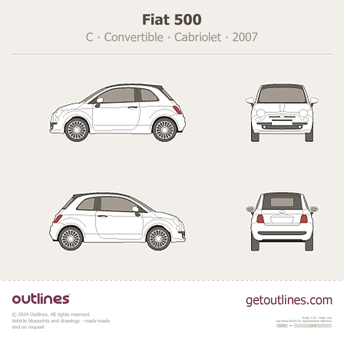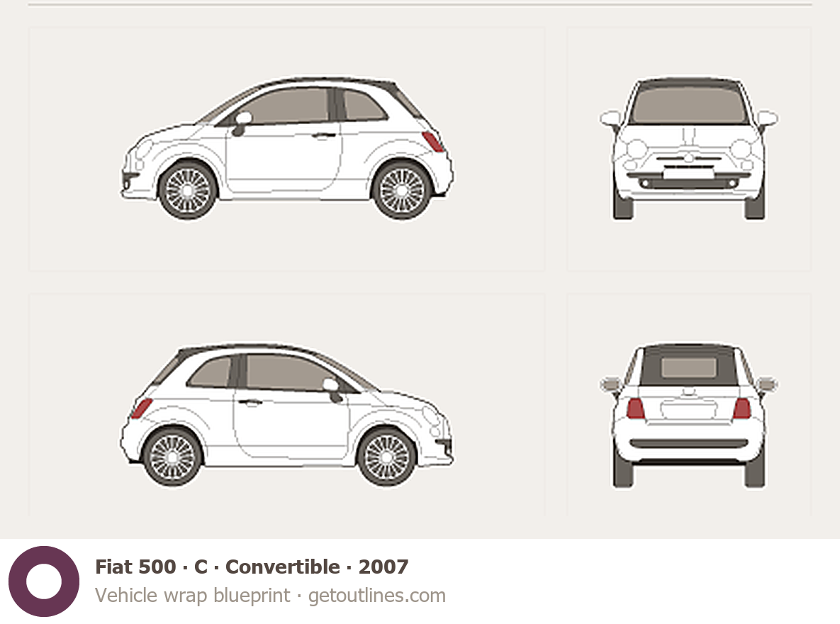 This 2007 Fiat 500 C Convertible Cabriolet blueprint helps designers, wrap studios, and 3D artists simplify their workflow and save valuable time for creative work instead of routine tasks.
