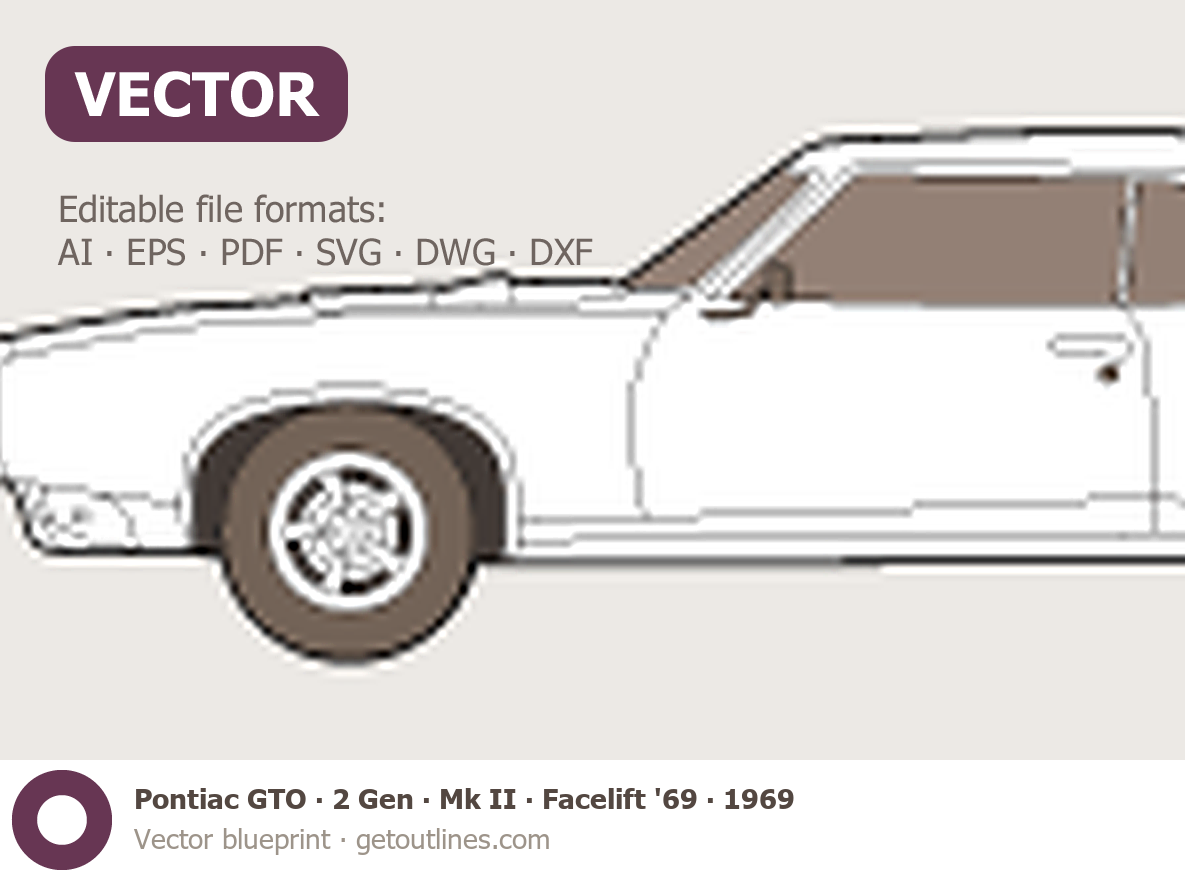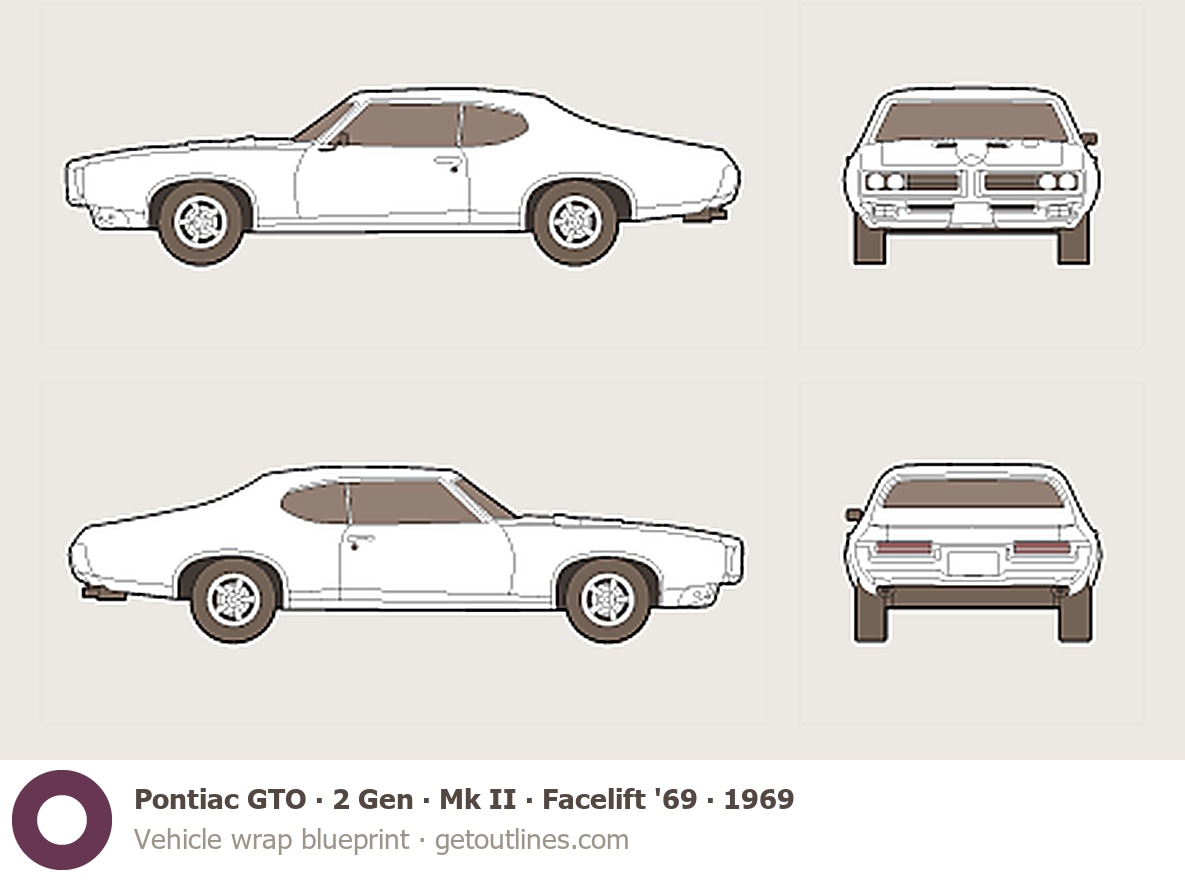 Buy this Pontiac GTO 2 Gen ∙ Mk II ∙ Facelift '69 blueprint and line drawing in high-quality editable vector file formats. Best for 3D and car wrap design.