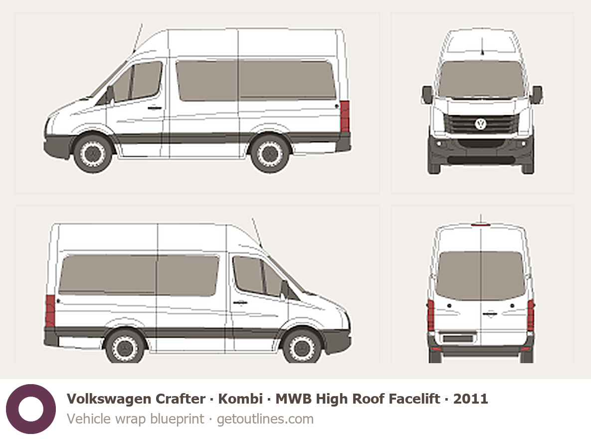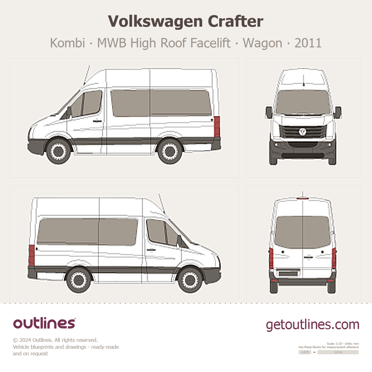 This 2011 Volkswagen Crafter Kombi MWB High Roof Facelift Wagon blueprint helps designers, wrap studios, and 3D artists simplify their workflow and save valuable time for creative work instead of routine tasks.