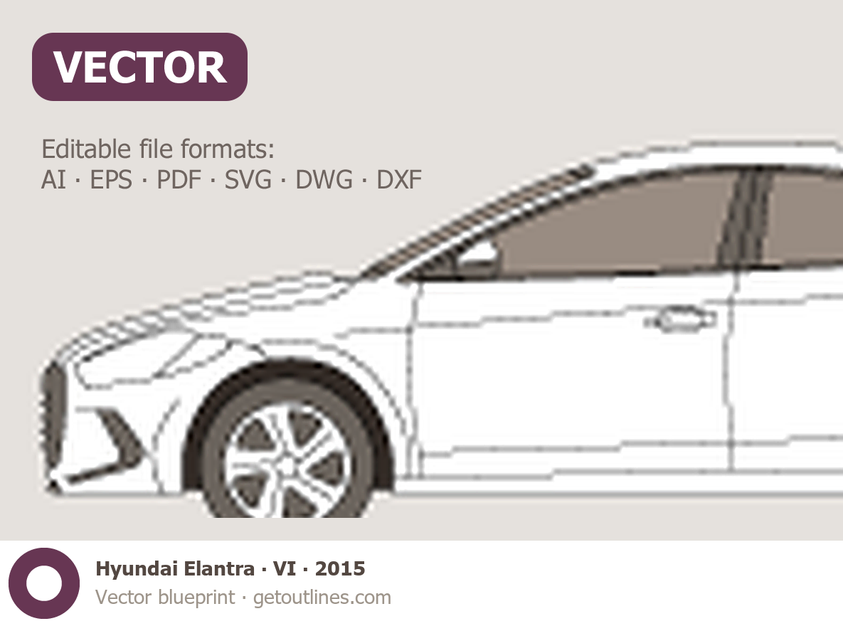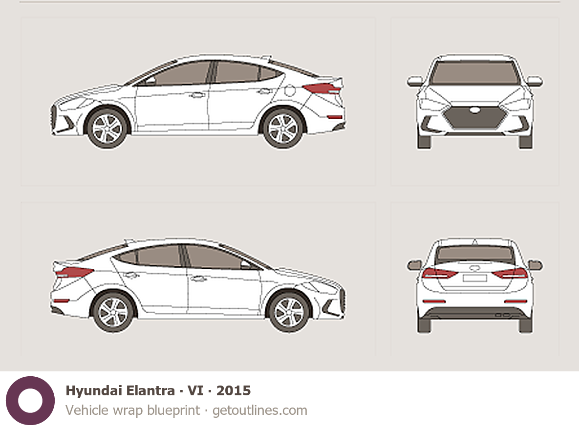 This 2015 Hyundai Elantra VI Sedan blueprint helps designers, wrap studios, and 3D artists simplify their workflow and save valuable time for creative work instead of routine tasks.