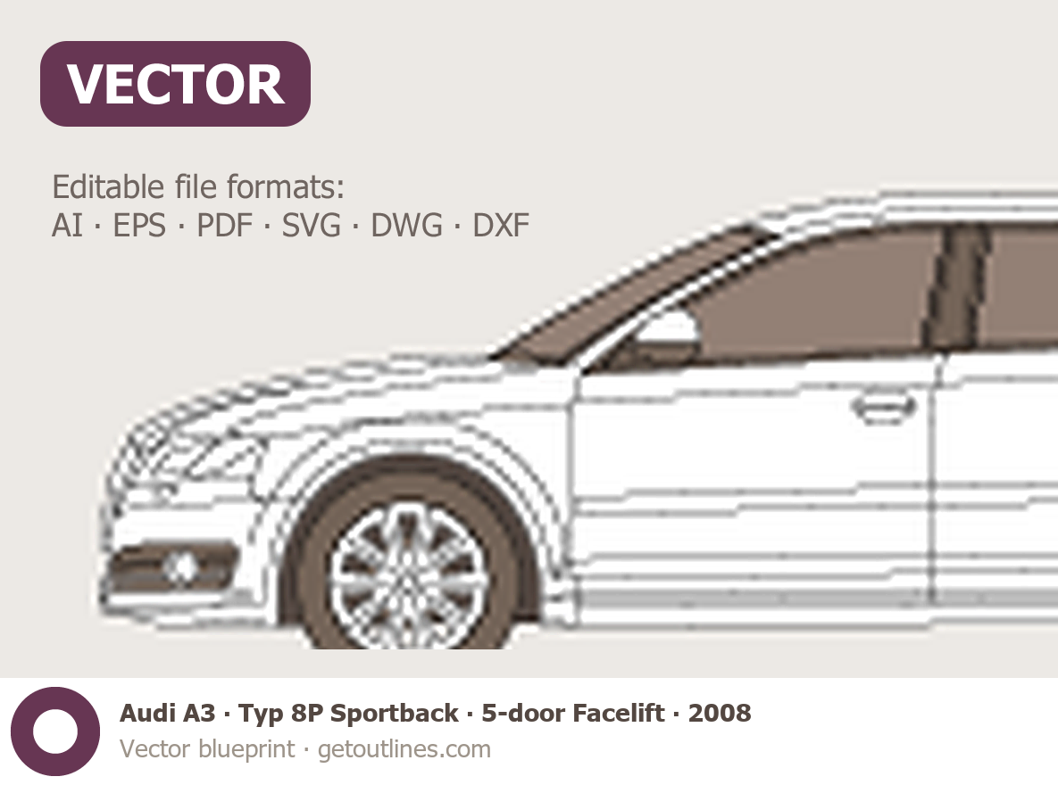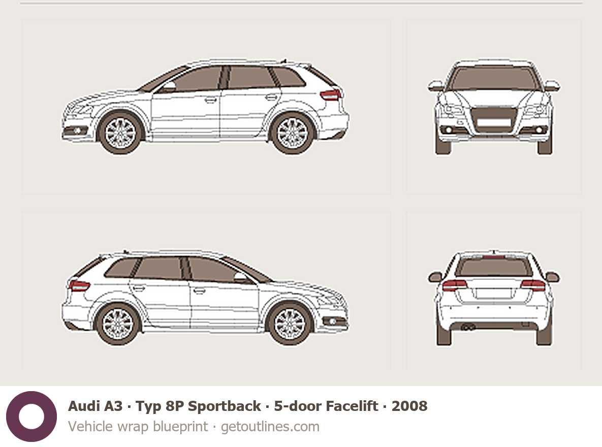 This 2008 Audi A3 Typ 8P Sportback 5-door Facelift Hatchback blueprint helps designers, wrap studios, and 3D artists simplify their workflow and save valuable time for creative work instead of routine tasks.
