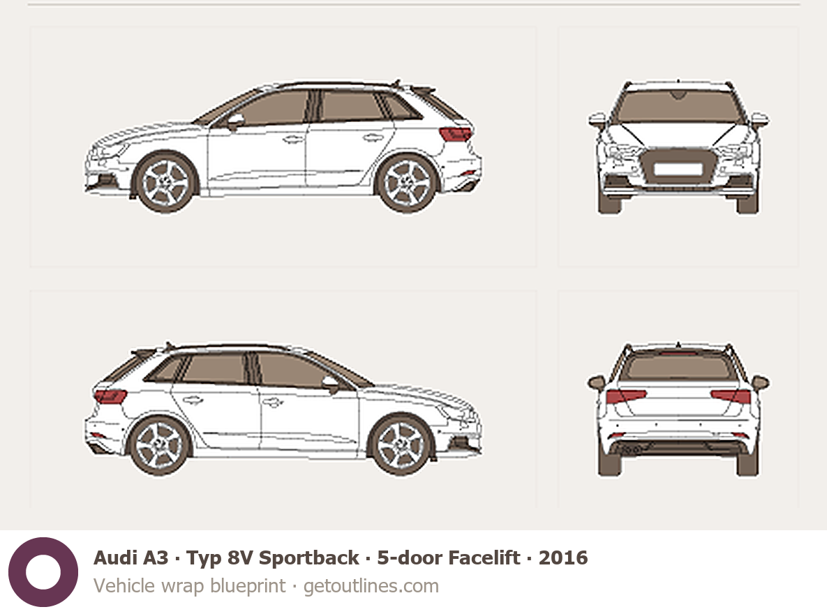 This 2016 Audi A3 Typ 8V Sportback 5-door Facelift Hatchback blueprint helps designers, wrap studios, and 3D artists simplify their workflow and save valuable time for creative work instead of routine tasks.