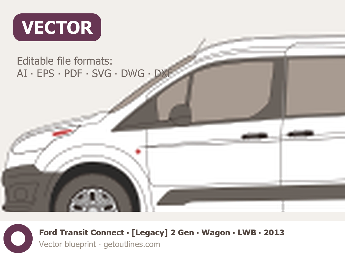 This 2013 Ford Transit Connect [Legacy] 2 Gen ∙ Wagon LWB Minivan blueprint helps designers, wrap studios, and 3D artists simplify their workflow and save valuable time for creative work instead of routine tasks.