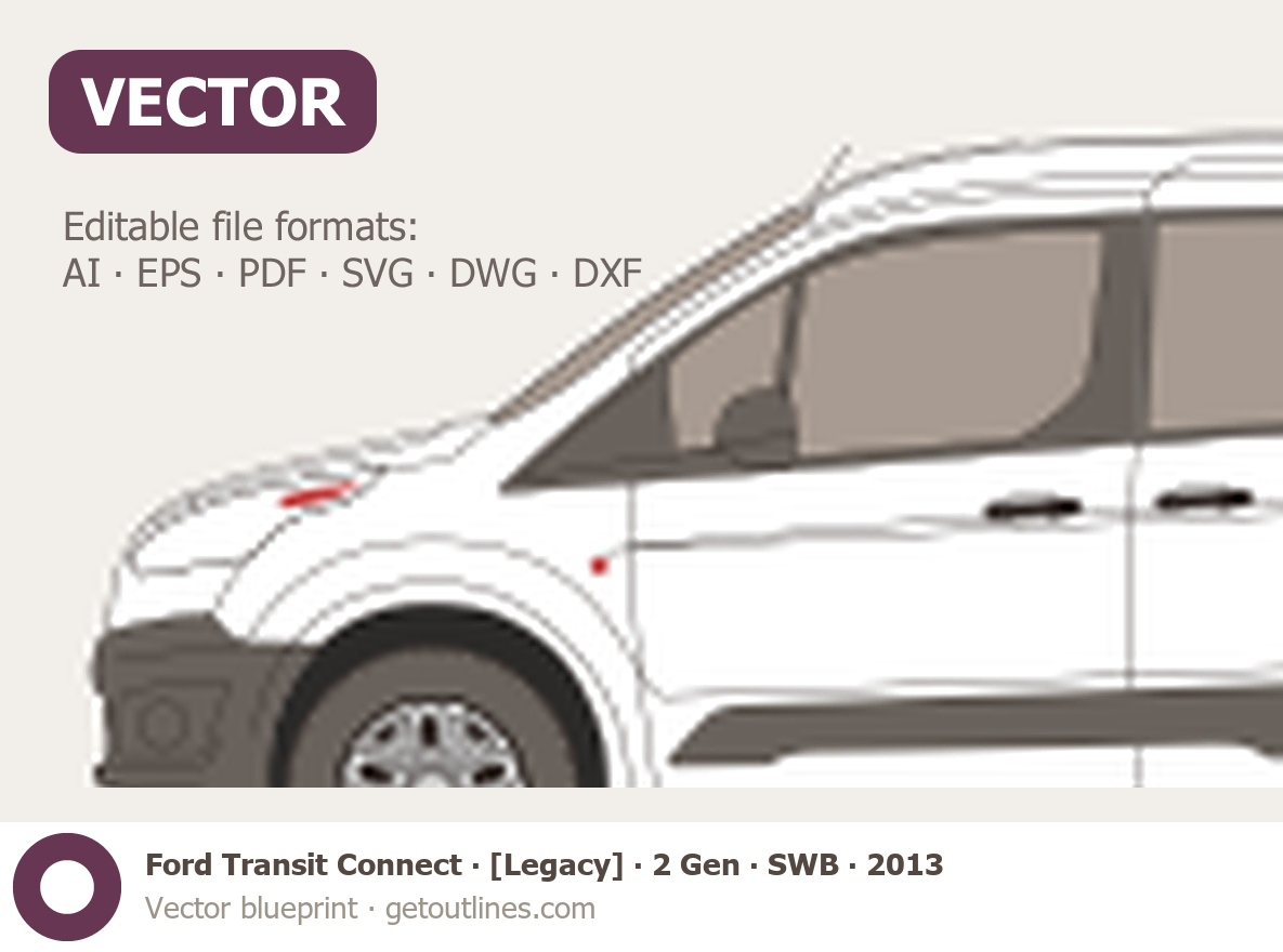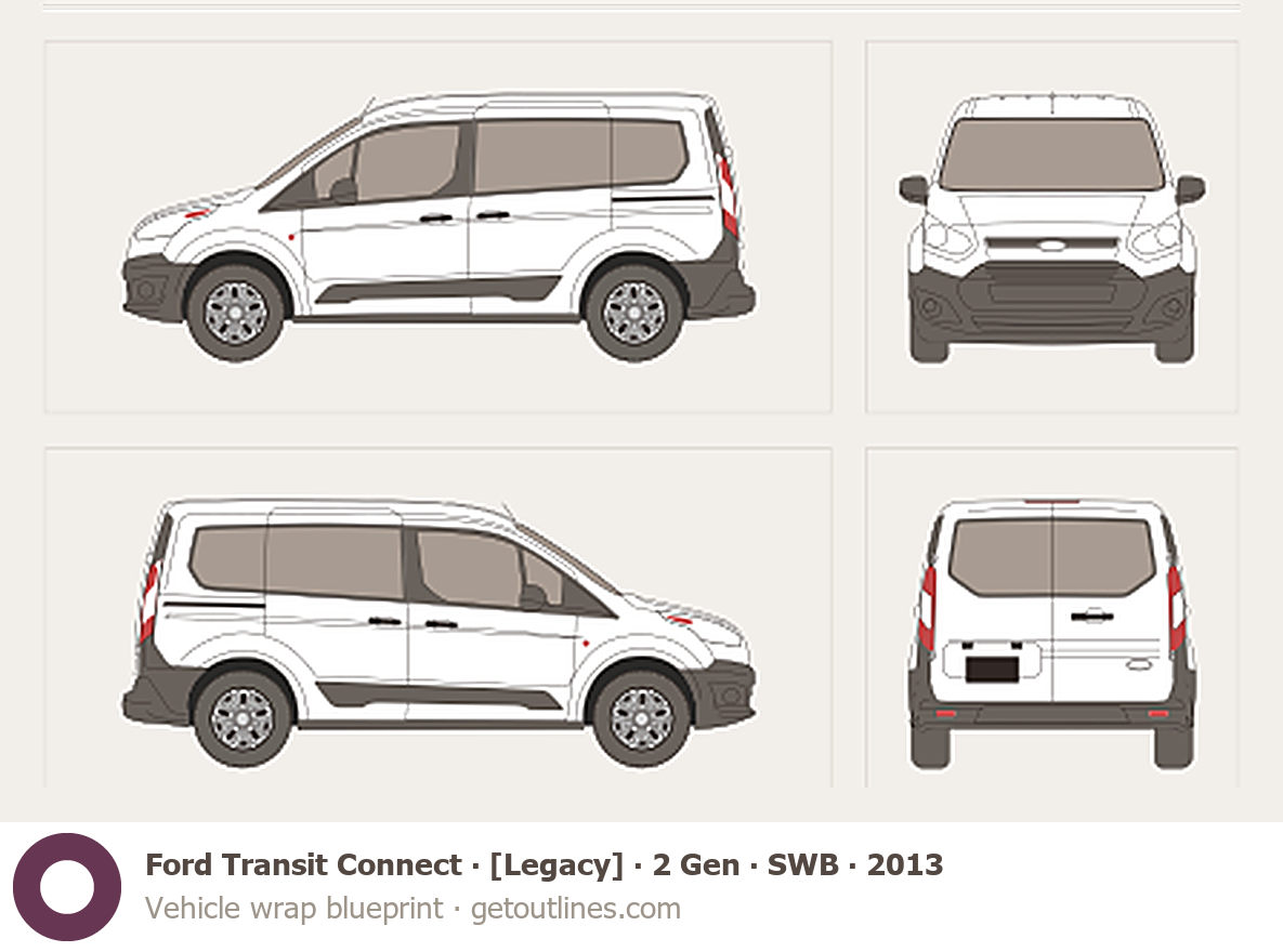 This 2013 Ford Transit Connect [Legacy] ∙ 2 Gen SWB Minivan blueprint helps designers, wrap studios, and 3D artists simplify their workflow and save valuable time for creative work instead of routine tasks.