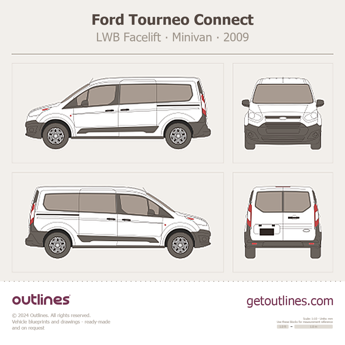 This is a blueprint of the Tourneo Connect, produced by carmaker Ford in 2009 - 2013. It features a Minivan body design and is classified as a Commercial vehicle.