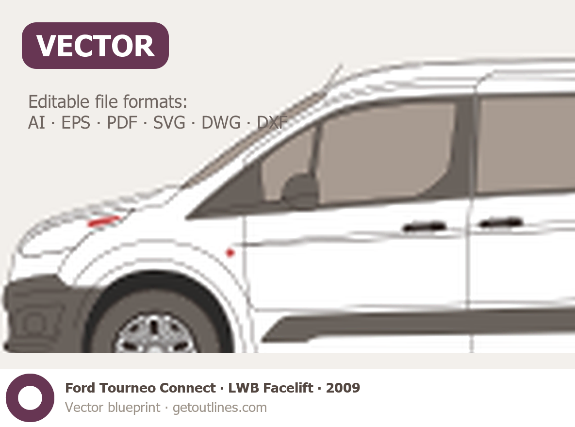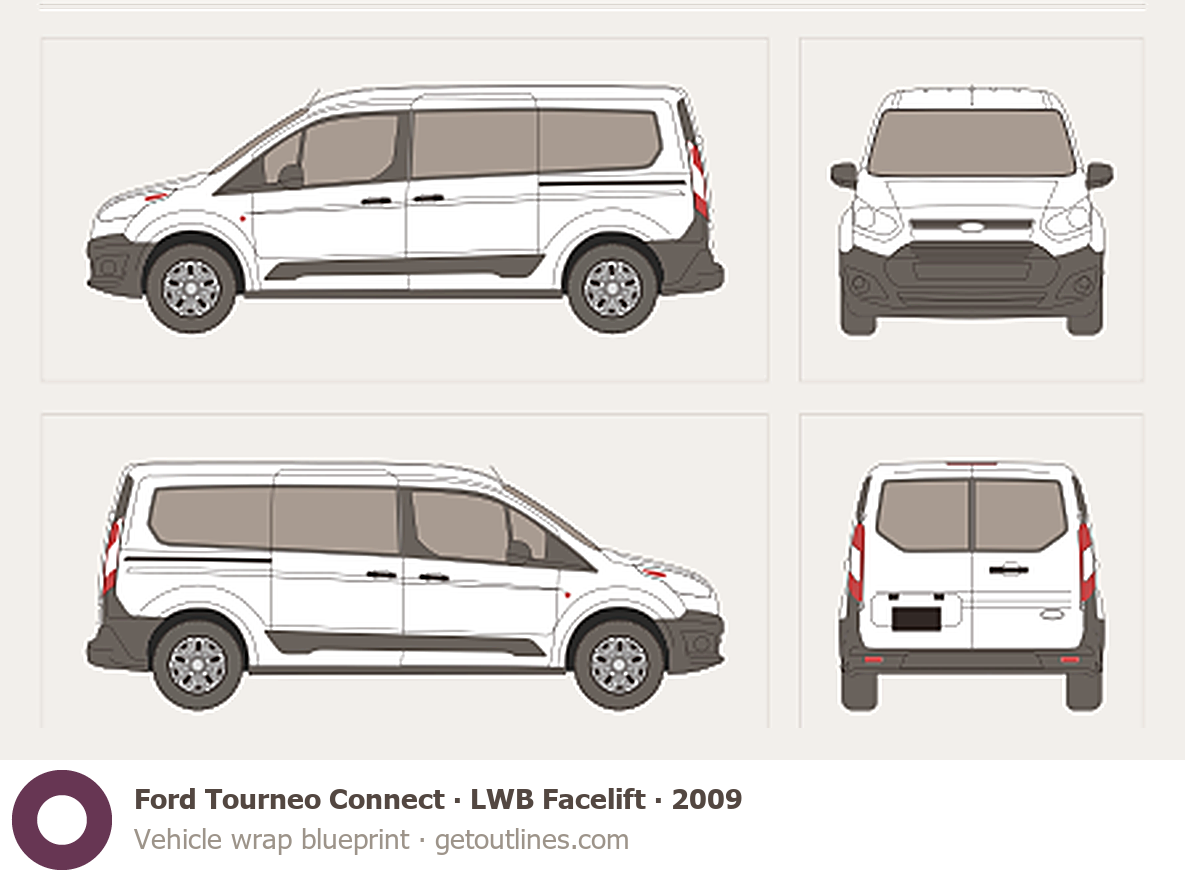This 2013 Ford Tourneo Connect 2 Gen LWB Minivan blueprint helps designers, wrap studios, and 3D artists simplify their workflow and save valuable time for creative work instead of routine tasks.