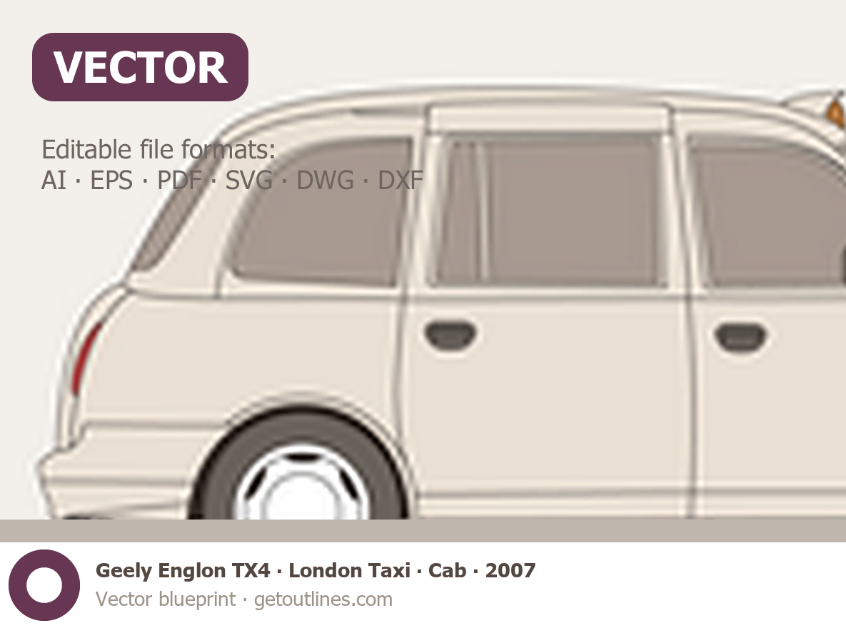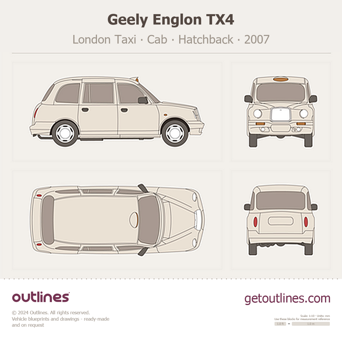 This 2007 Geely Englon TX4 London Taxi Cab Hatchback blueprint helps designers, wrap studios, and 3D artists simplify their workflow and save valuable time for creative work instead of routine tasks.