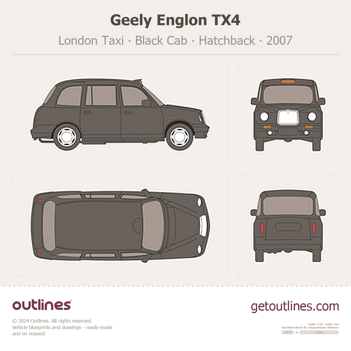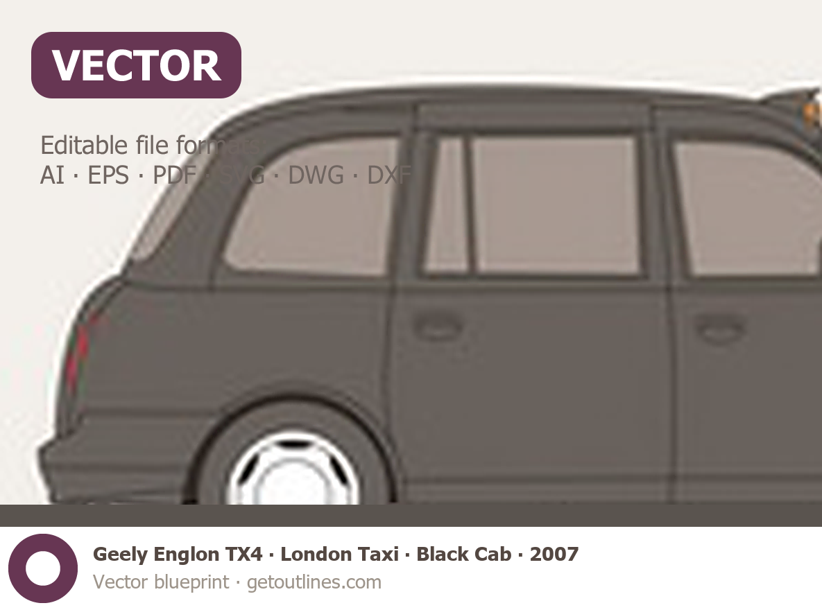 This 2007 Geely Englon TX4 London Taxi Black Cab Hatchback blueprint helps designers, wrap studios, and 3D artists simplify their workflow and save valuable time for creative work instead of routine tasks.