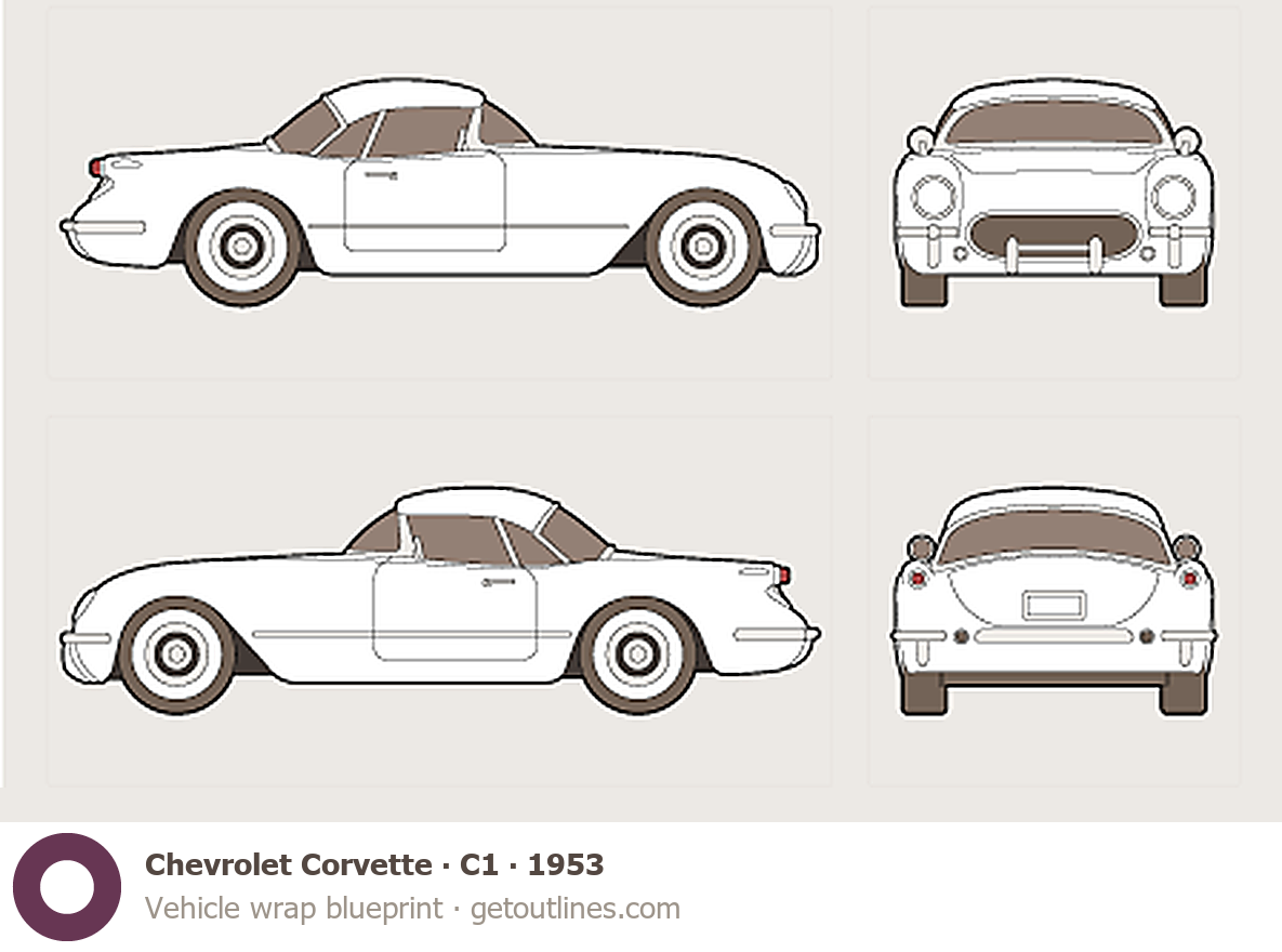 This template is suitable for Chevrolet Corvette models from 1953 to 1955, including 1953, 1954, and 1955 model years, and is commonly used for vehicle wrap and signage design.