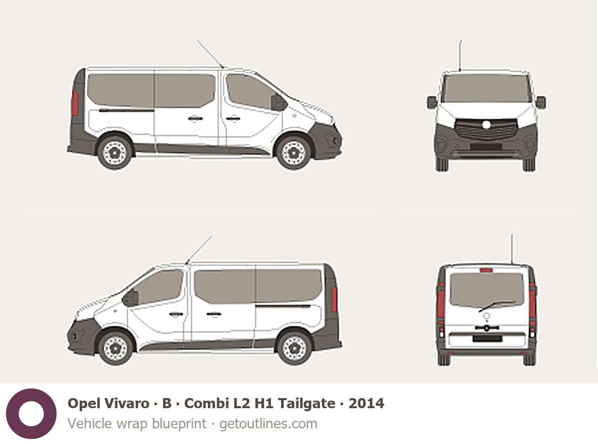 This 2014 Opel Vivaro B Combi L2 H1 Tailgate Minivan blueprint helps designers, wrap studios, and 3D artists simplify their workflow and save valuable time for creative work instead of routine tasks.