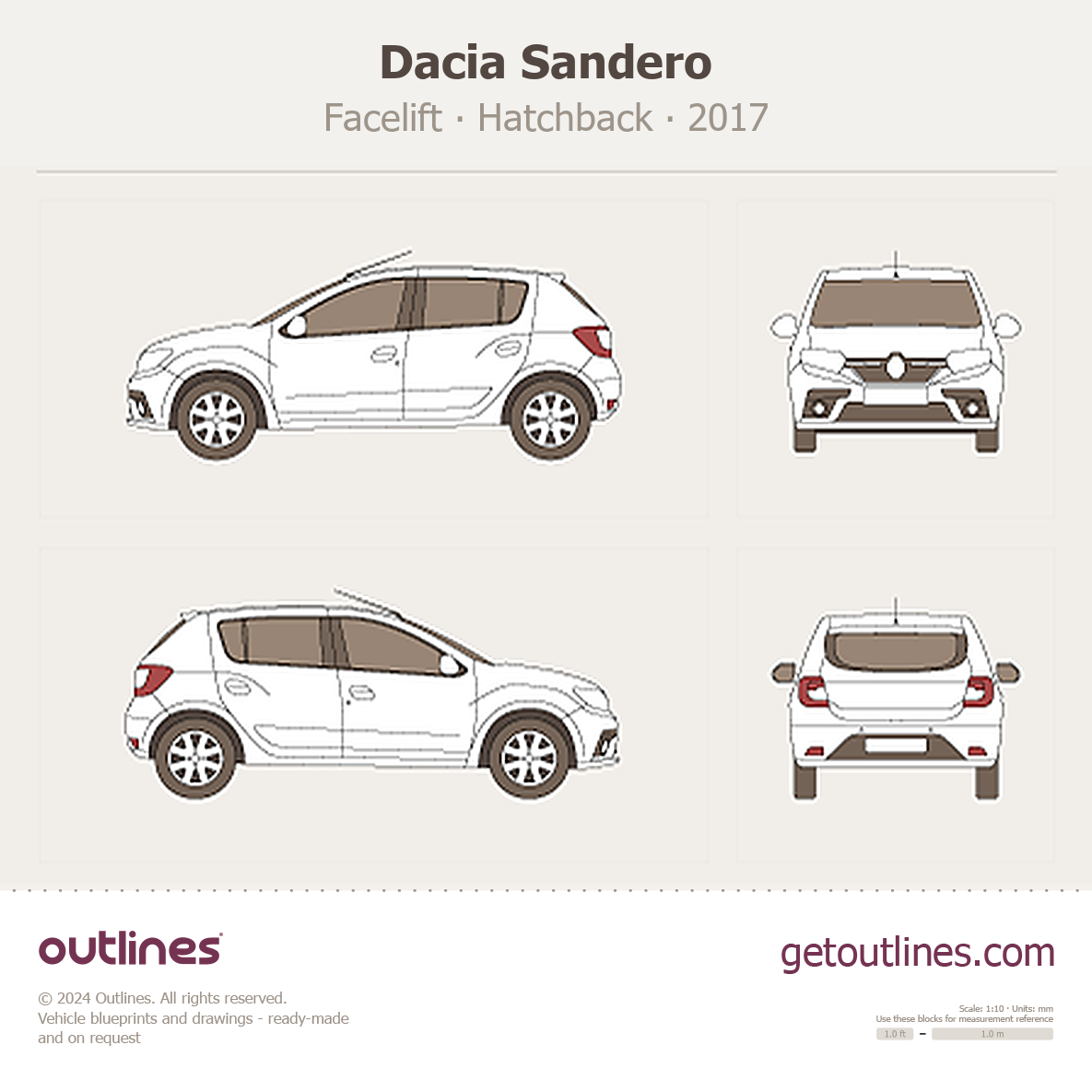 This is a blueprint of the Sandero, produced by carmaker Dacia in 2017 - Present (2025, 2026). It features a Hatchback body design and is classified as a Family vehicle.