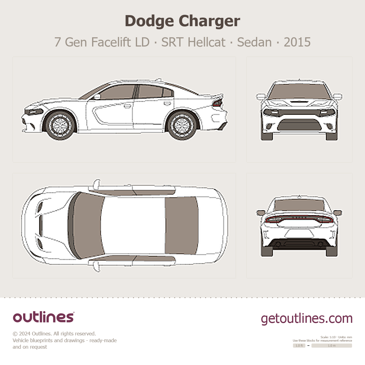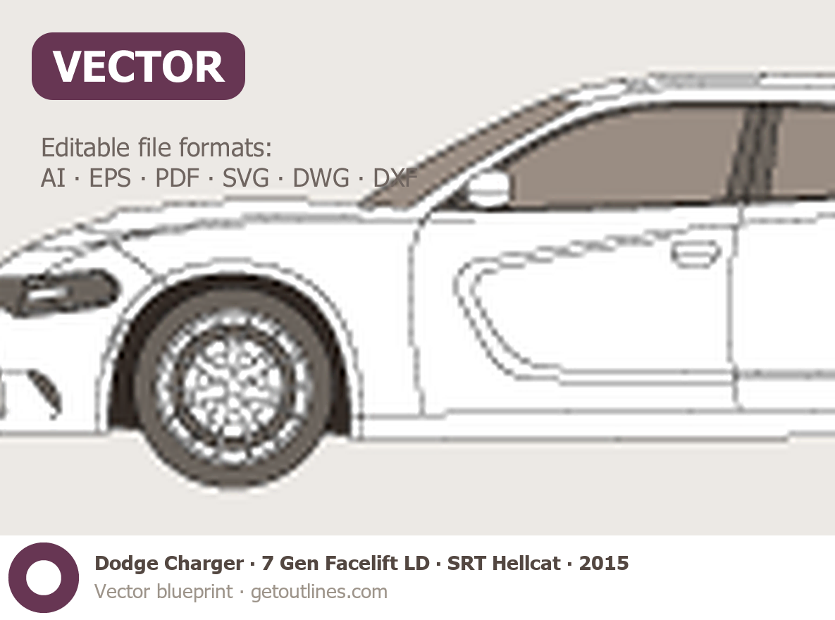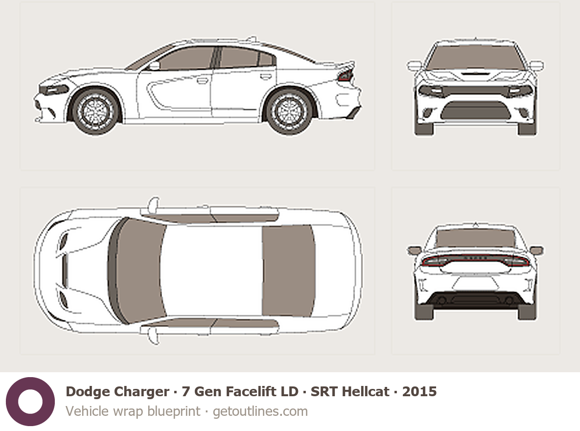 This 2015 Dodge Charger 7 Gen Facelift LD SRT Hellcat Sedan blueprint helps designers, wrap studios, and 3D artists simplify their workflow and save valuable time for creative work instead of routine tasks.