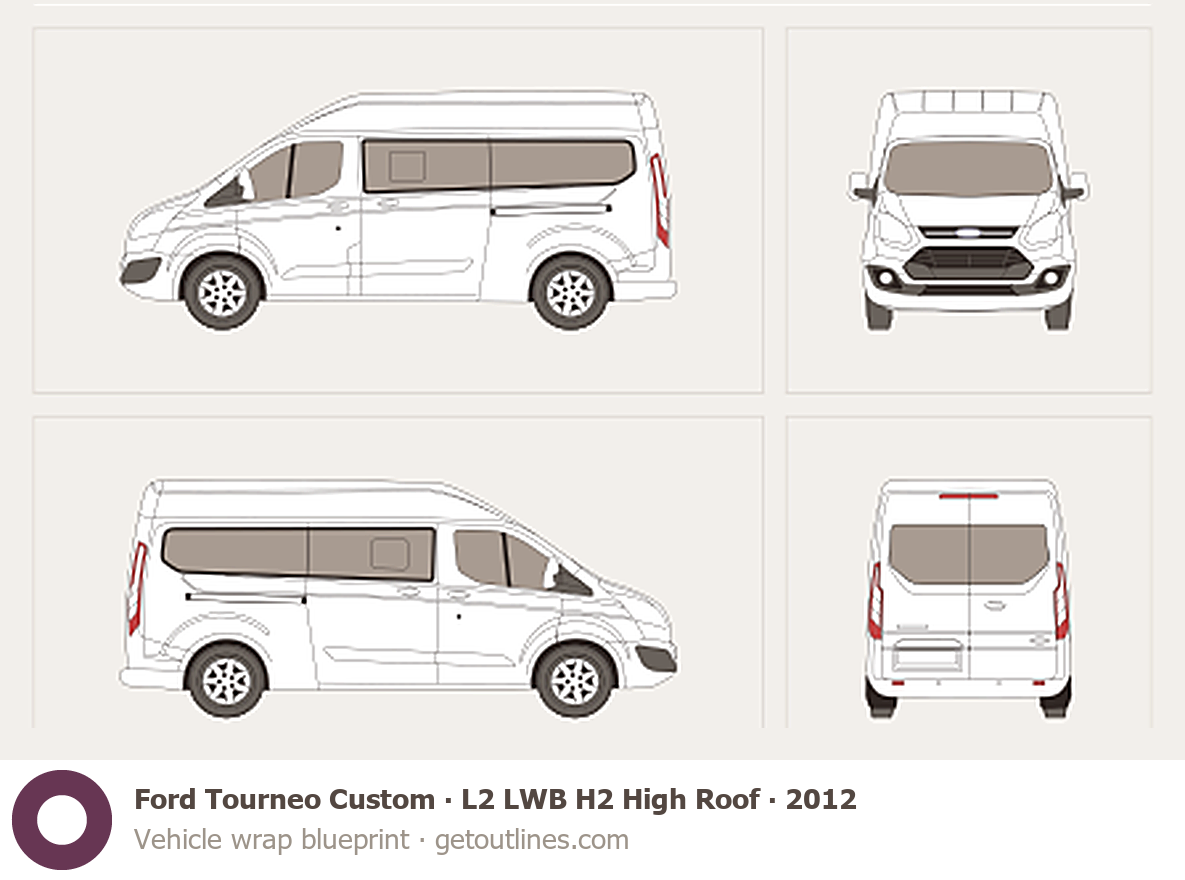 This 2012 Ford Tourneo Custom L2 LWB H2 High Roof Minivan blueprint helps designers, wrap studios, and 3D artists simplify their workflow and save valuable time for creative work instead of routine tasks.