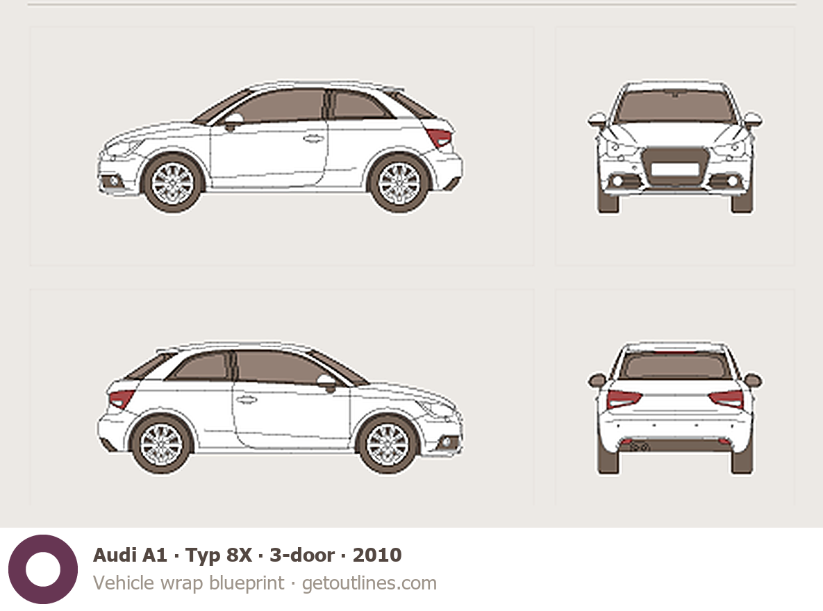 Buy this Audi A1 Typ 8X blueprint and line drawing in high-quality editable vector file formats. Best for 3D and car wrap design.