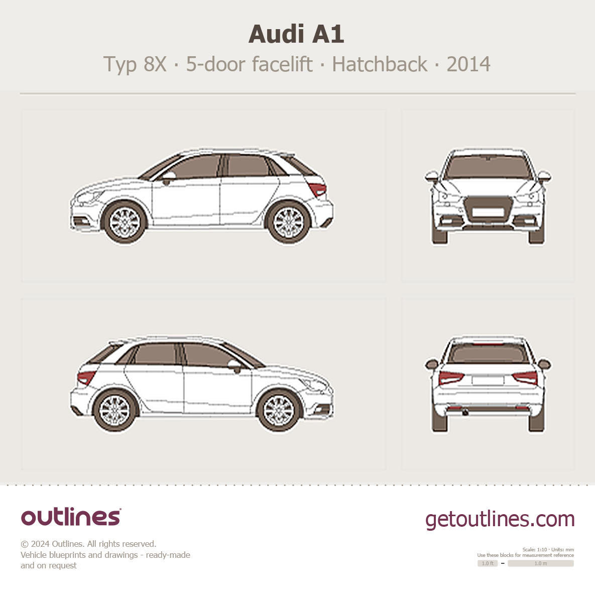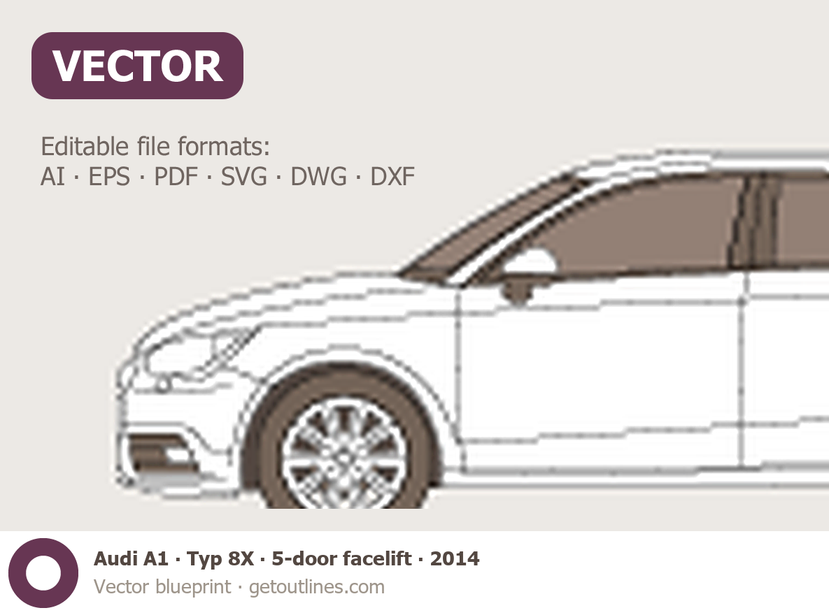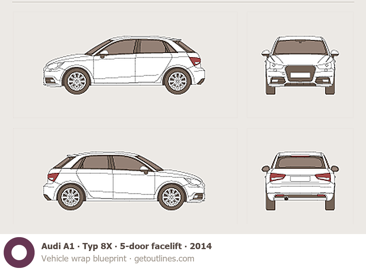 This 2014 Audi A1 Typ 8X 5-door facelift Hatchback blueprint helps designers, wrap studios, and 3D artists simplify their workflow and save valuable time for creative work instead of routine tasks.
