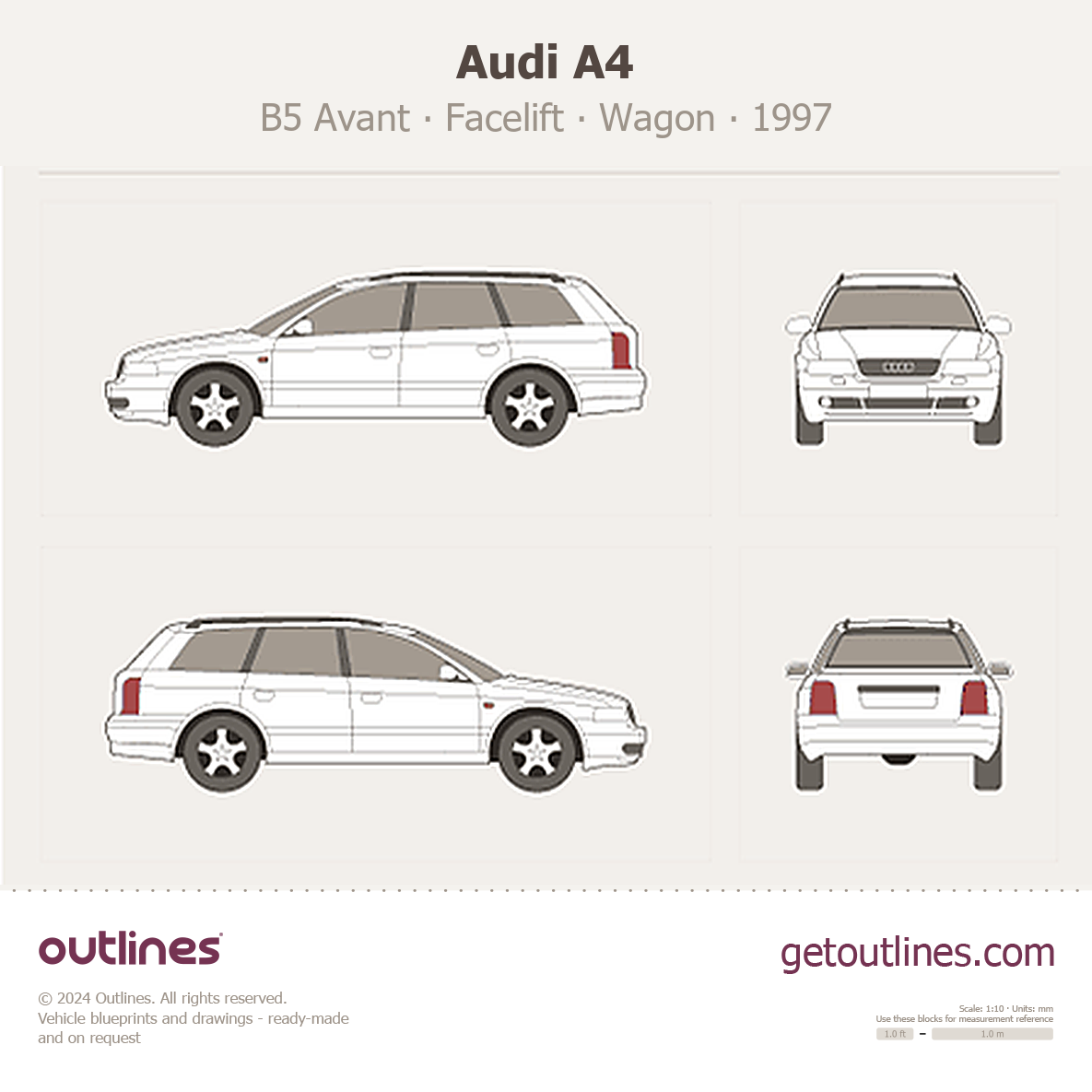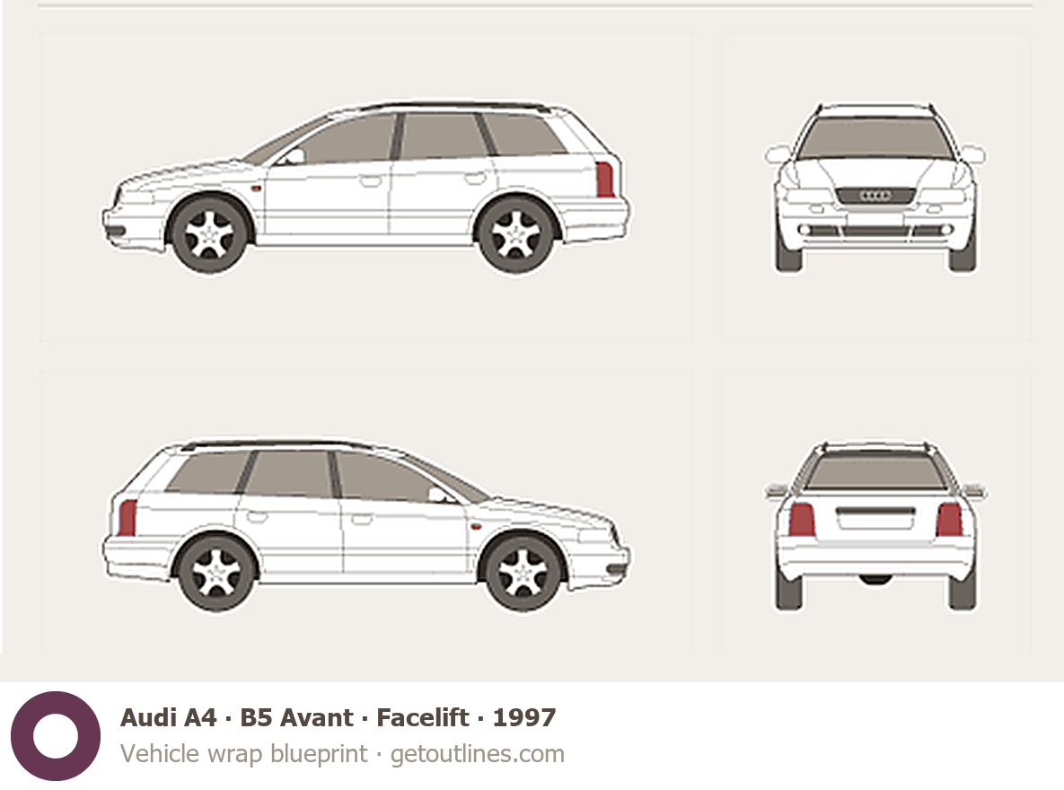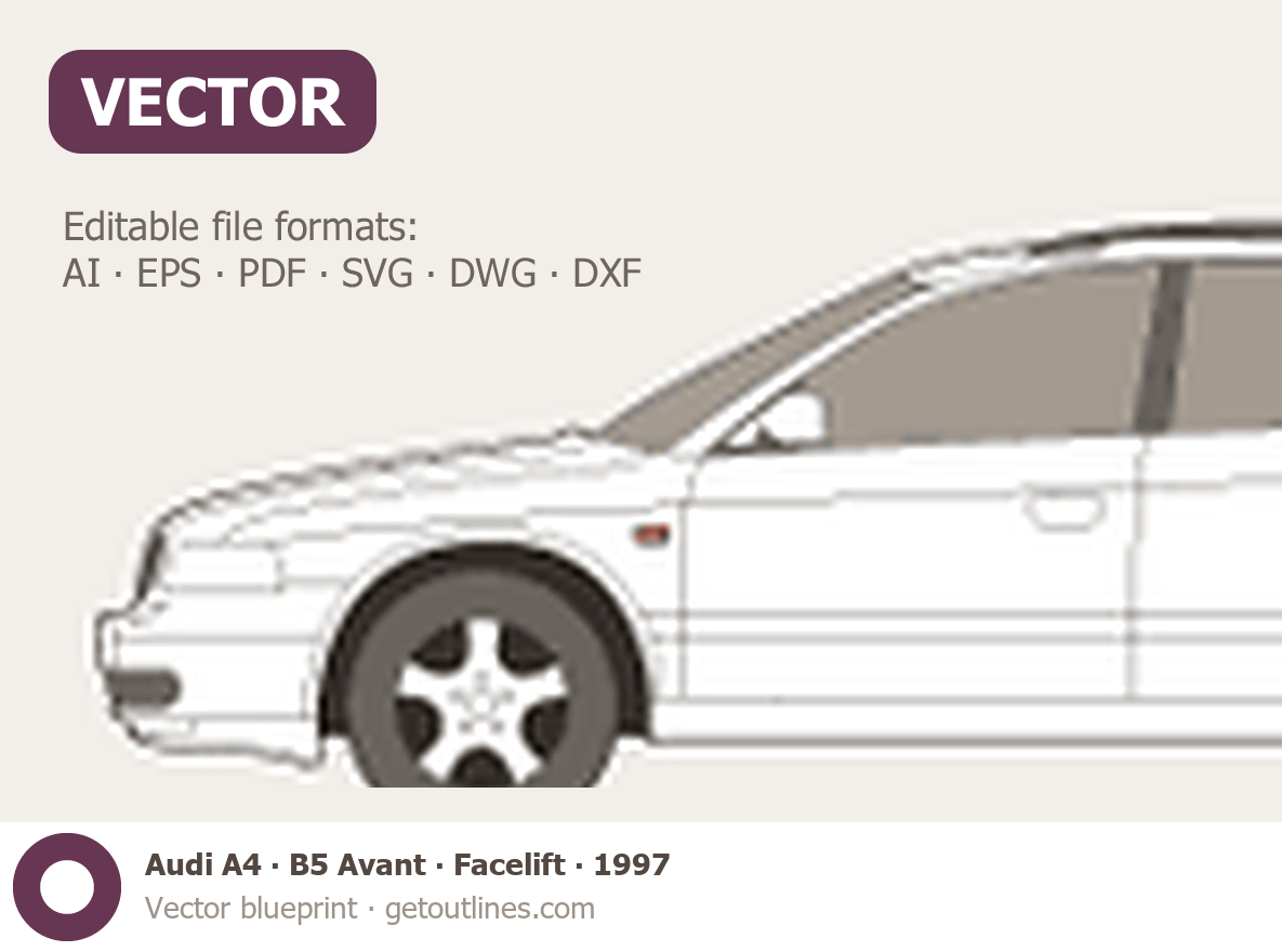 Buy this Audi A4 B5 Avant blueprint and line drawing in high-quality editable vector file formats. Best for 3D and car wrap design.