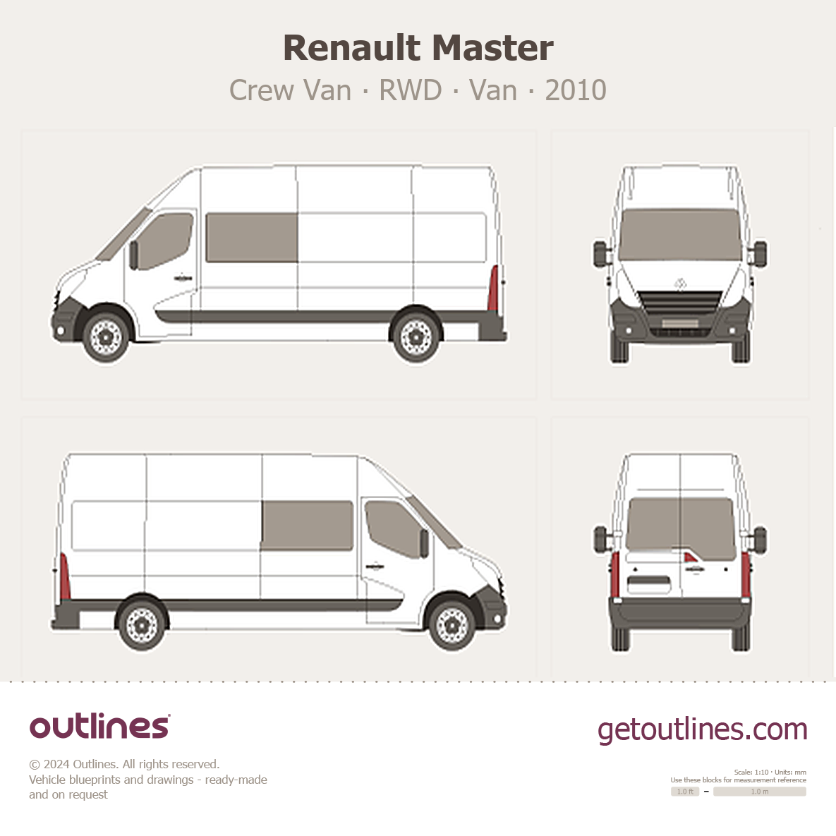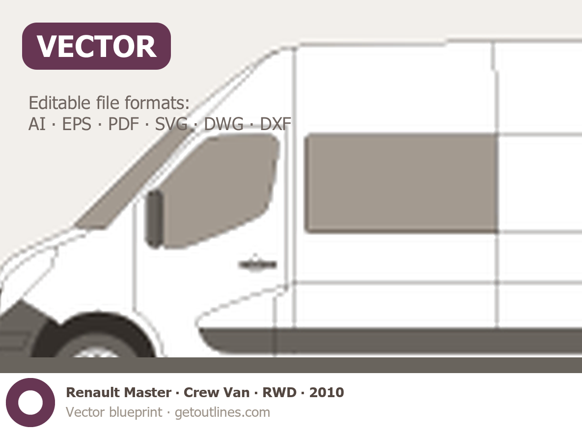 This 2010 Renault Master Crew Van RWD Van blueprint helps designers, wrap studios, and 3D artists simplify their workflow and save valuable time for creative work instead of routine tasks.