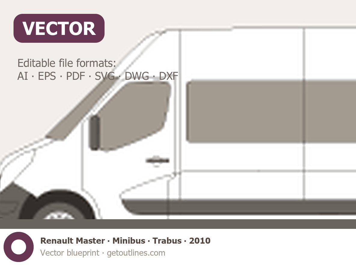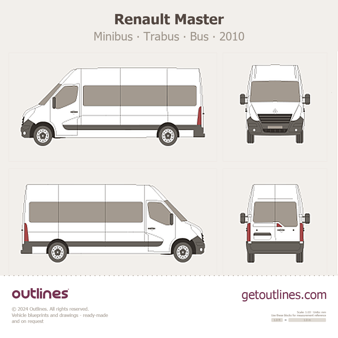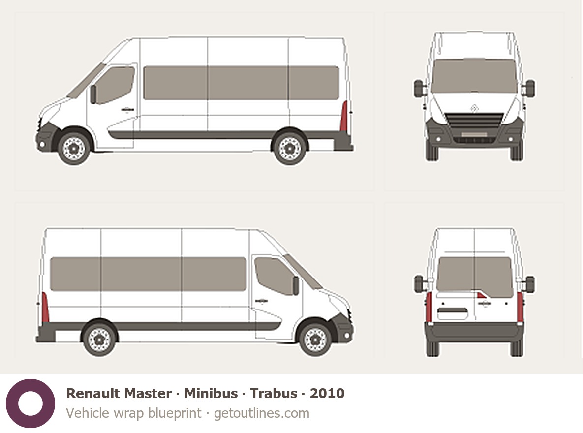 This 2010 Renault Master Minibus Trabus Bus blueprint helps designers, wrap studios, and 3D artists simplify their workflow and save valuable time for creative work instead of routine tasks.