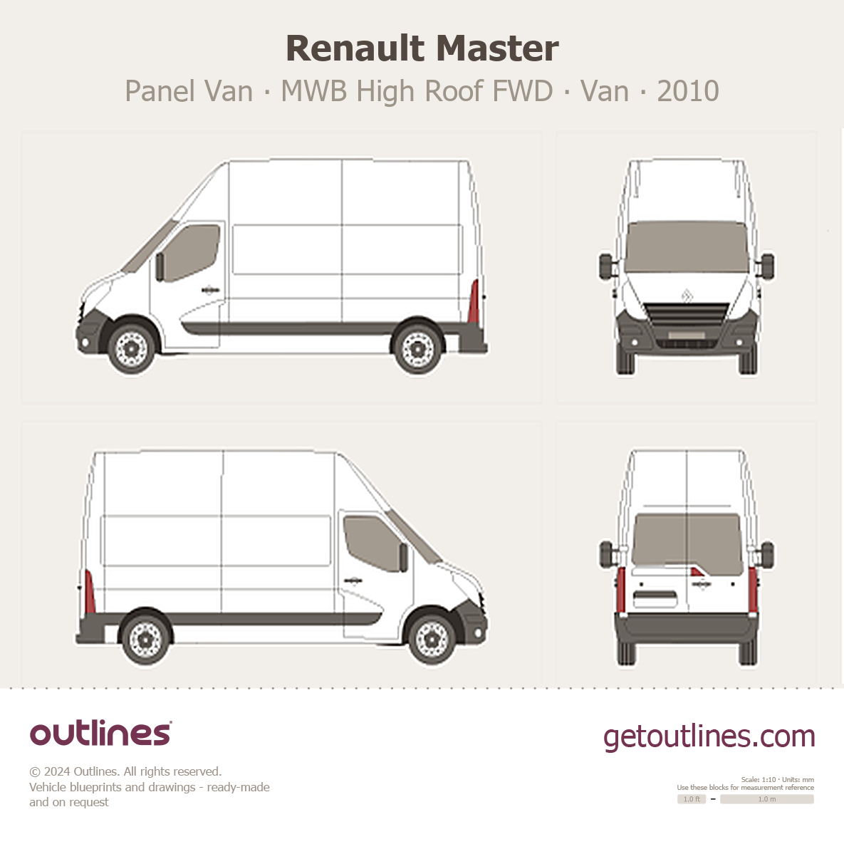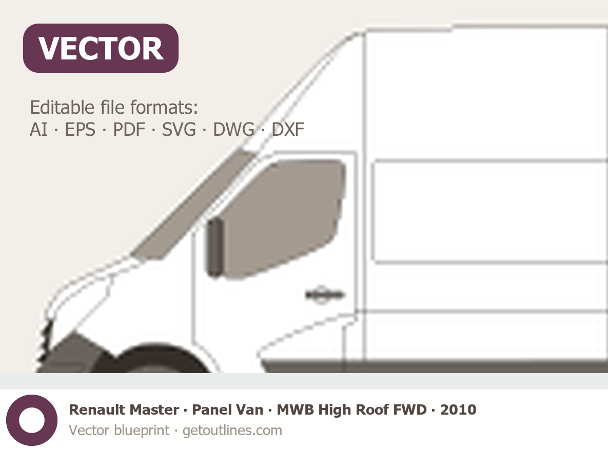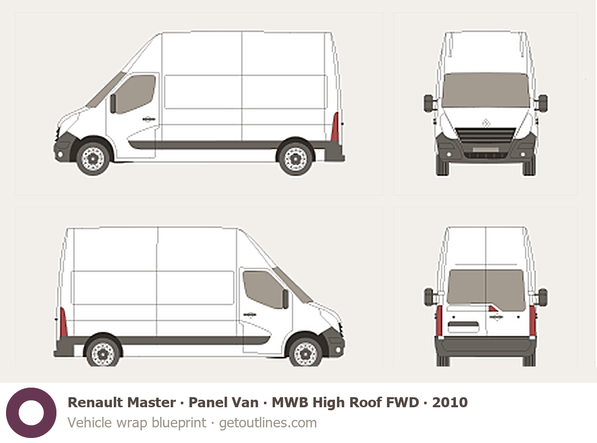 This 2010 Renault Master Panel Van MWB High Roof FWD Van blueprint helps designers, wrap studios, and 3D artists simplify their workflow and save valuable time for creative work instead of routine tasks.