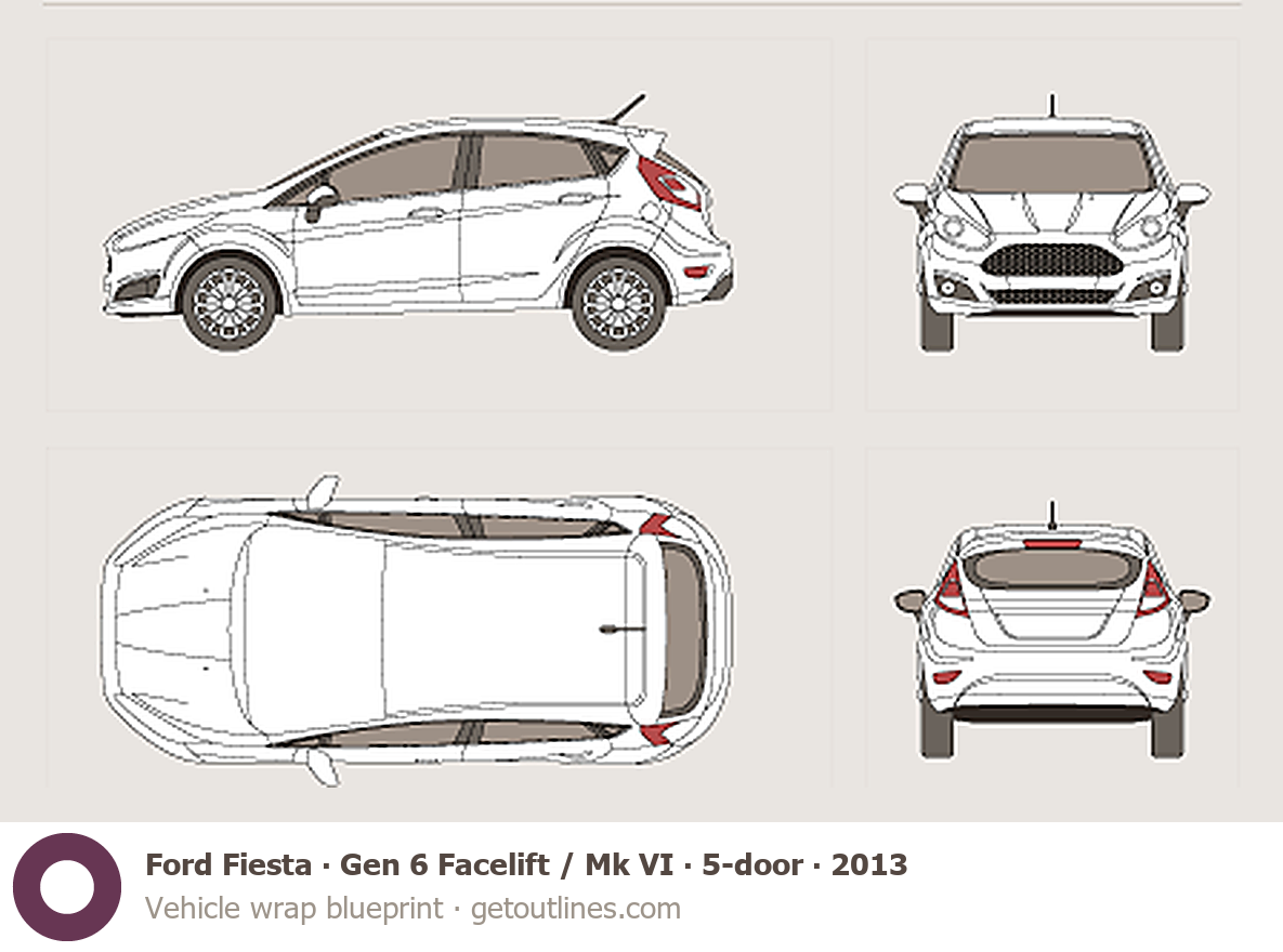 This 2013 Ford Fiesta Gen 6 Facelift / Mk VI 5-door Hatchback blueprint helps designers, wrap studios, and 3D artists simplify their workflow and save valuable time for creative work instead of routine tasks.