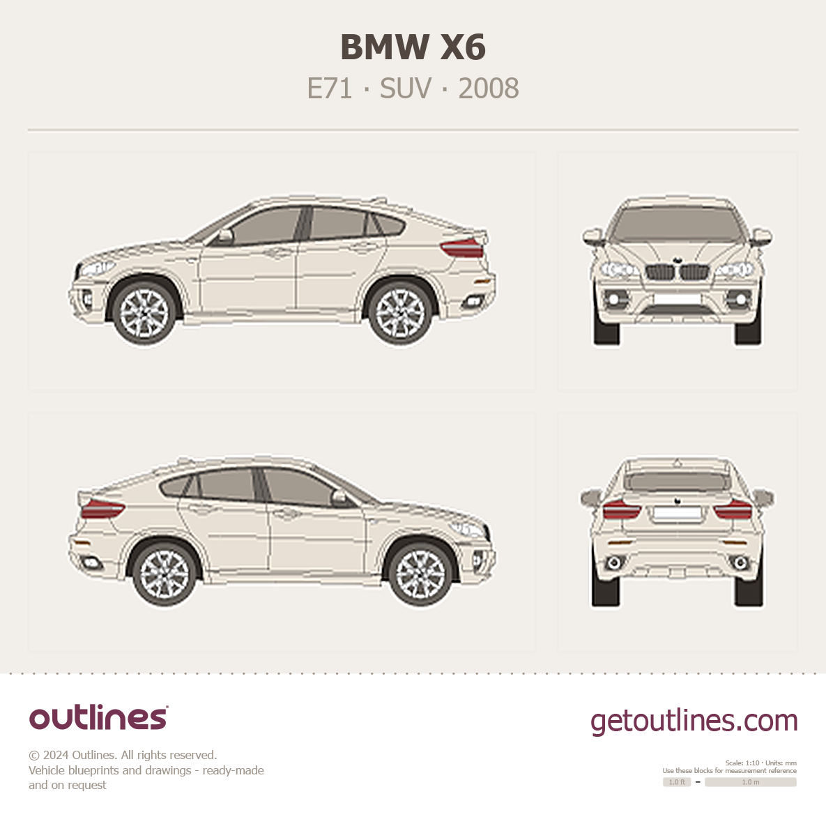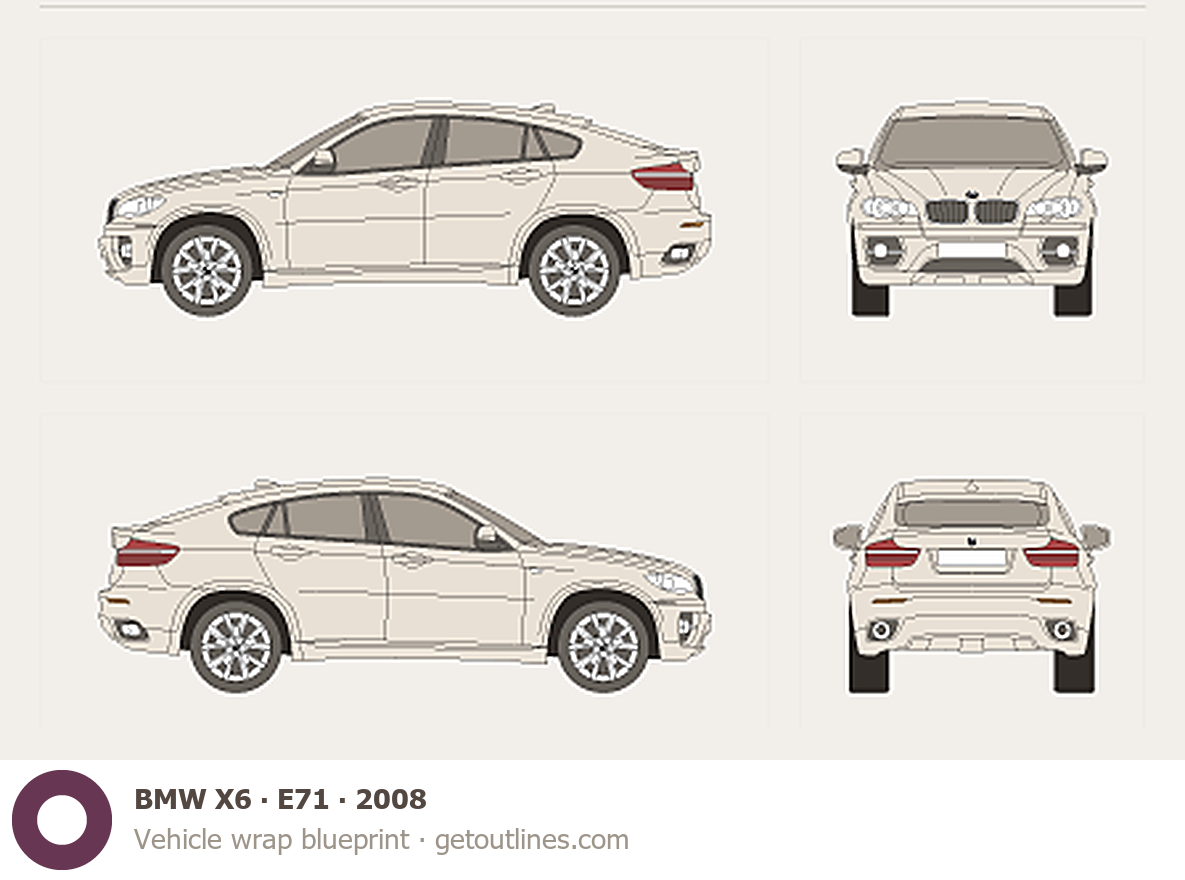 Buy this BMW X6 E71 blueprint and line drawing in high-quality editable vector file formats. Best for 3D and car wrap design.