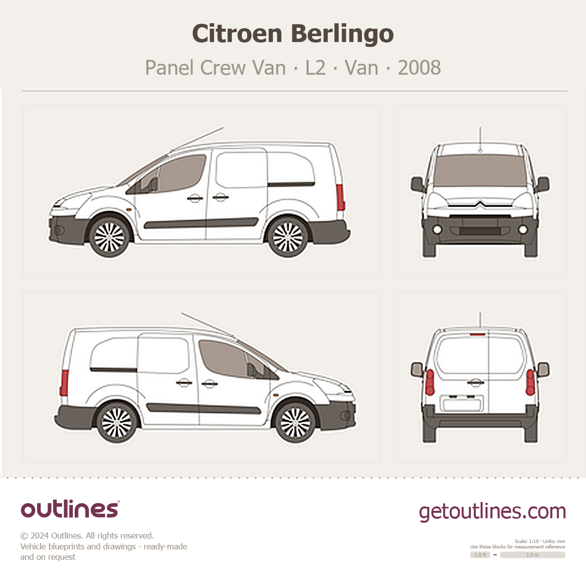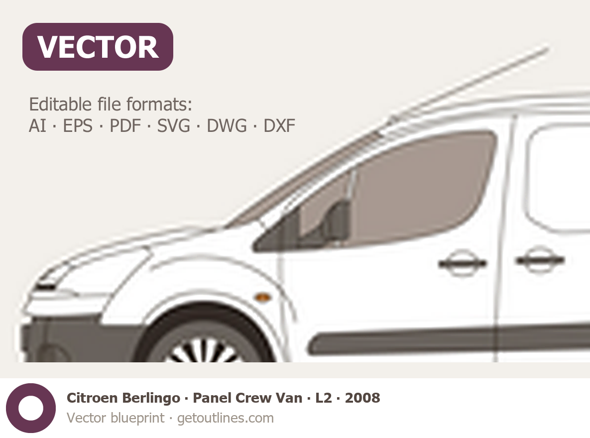 Buy this Citroen Berlingo Panel Crew Van blueprint and line drawing in high-quality editable vector file formats. Best for 3D and car wrap design.