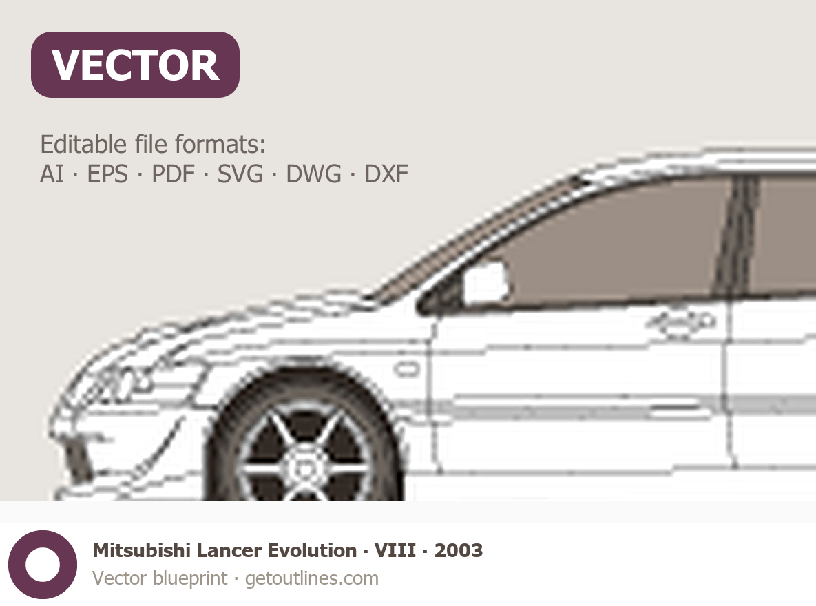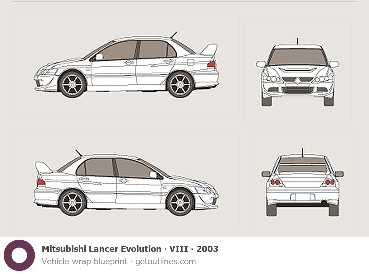 Buy this Mitsubishi Lancer Evolution VIII blueprint and line drawing in high-quality editable vector file formats. Best for 3D and car wrap design.