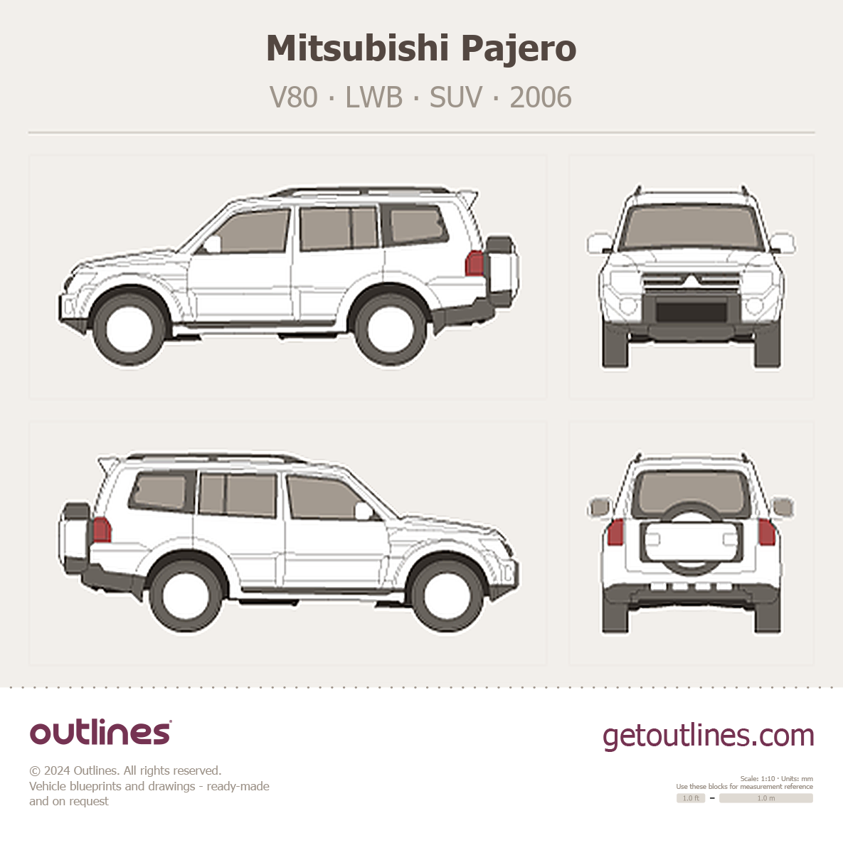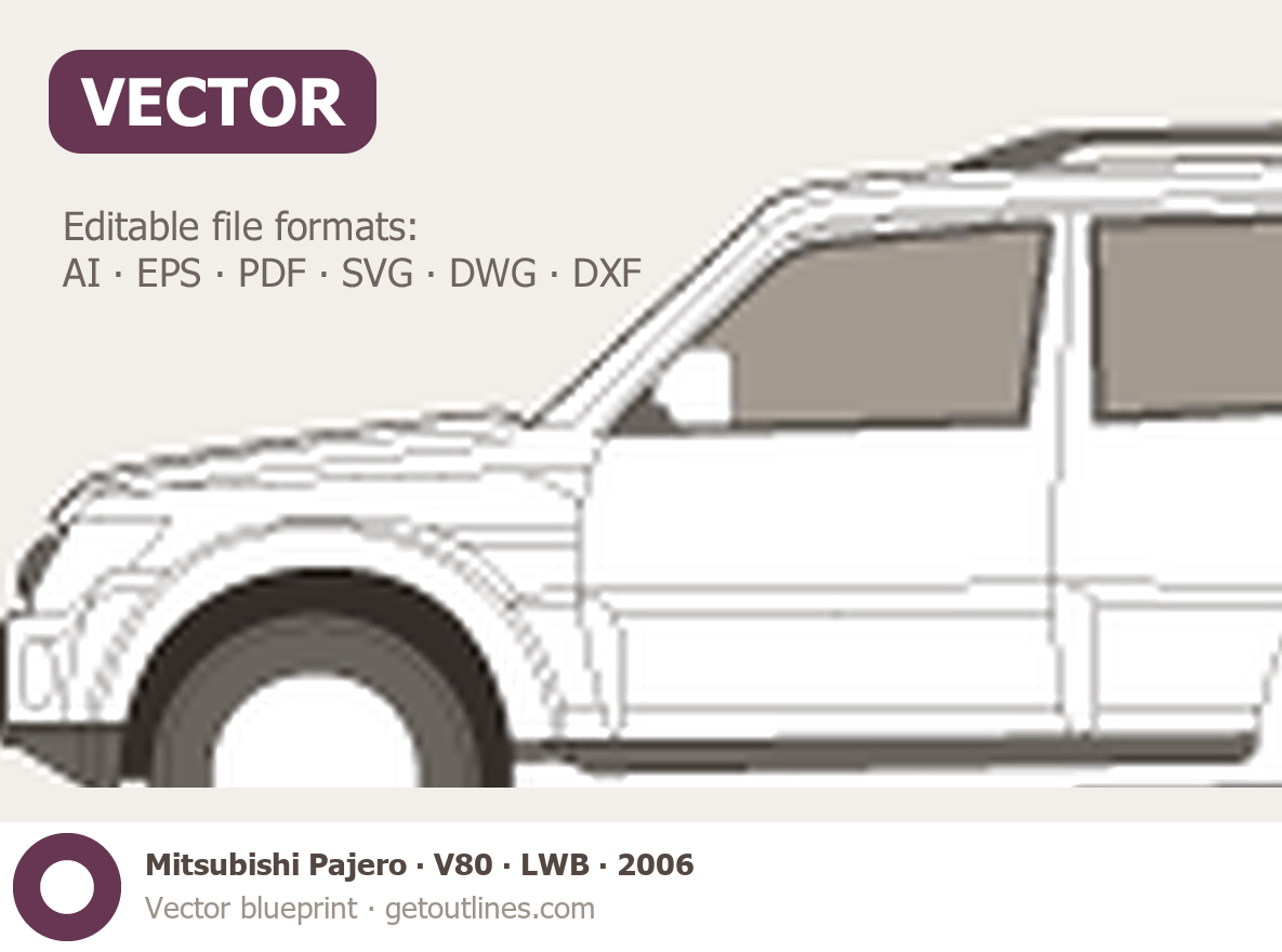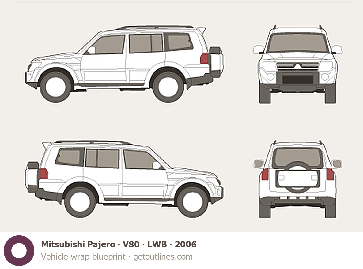 This 2006 Mitsubishi Pajero V80 LWB SUV blueprint helps designers, wrap studios, and 3D artists simplify their workflow and save valuable time for creative work instead of routine tasks.