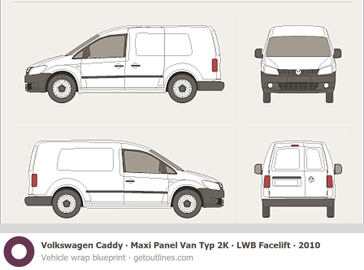 This 2010 Volkswagen Caddy Maxi Panel Van Typ 2K LWB Facelift Van blueprint helps designers, wrap studios, and 3D artists simplify their workflow and save valuable time for creative work instead of routine tasks.