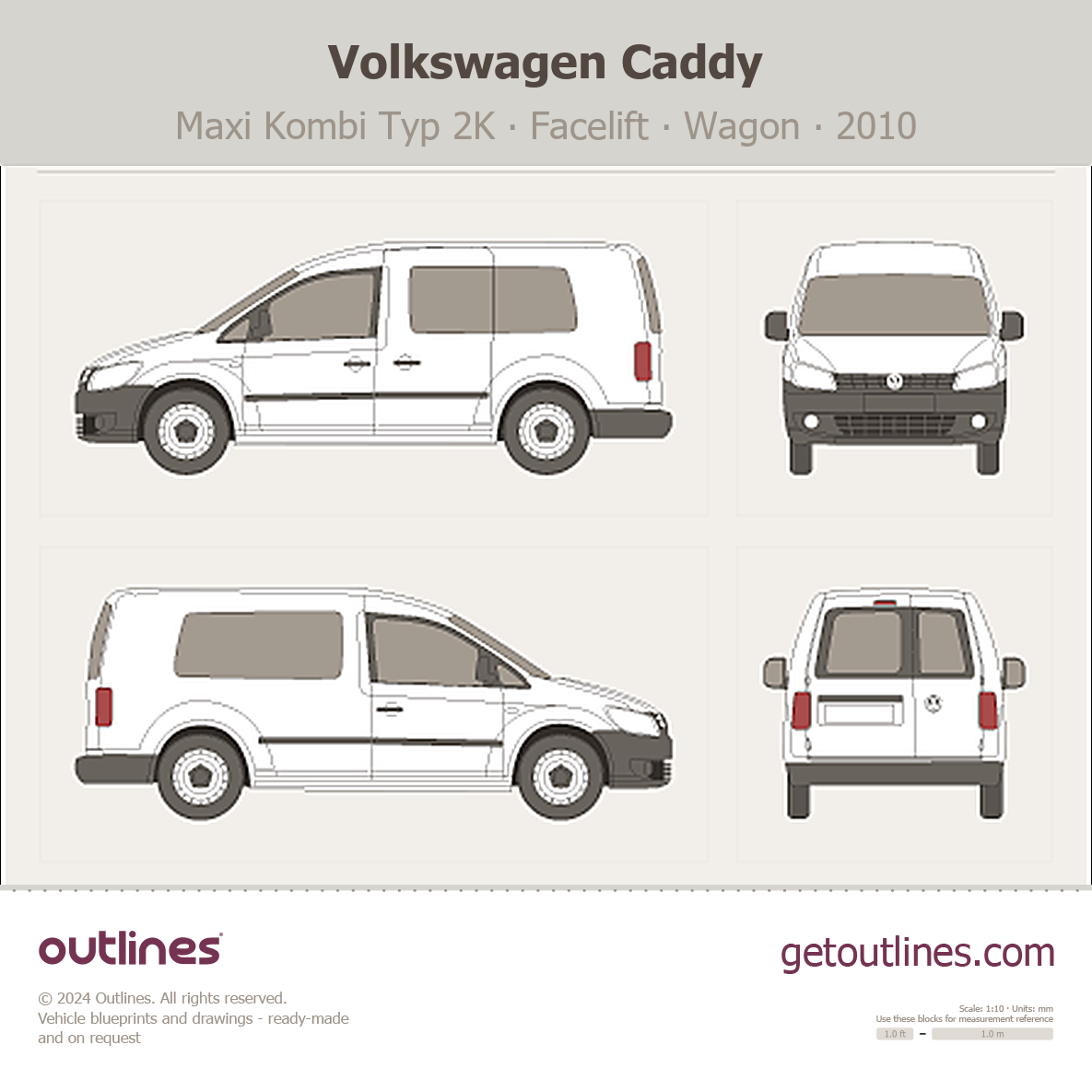 This 2010 Volkswagen Caddy Maxi Kombi Typ 2K Facelift Wagon blueprint helps designers, wrap studios, and 3D artists simplify their workflow and save valuable time for creative work instead of routine tasks.